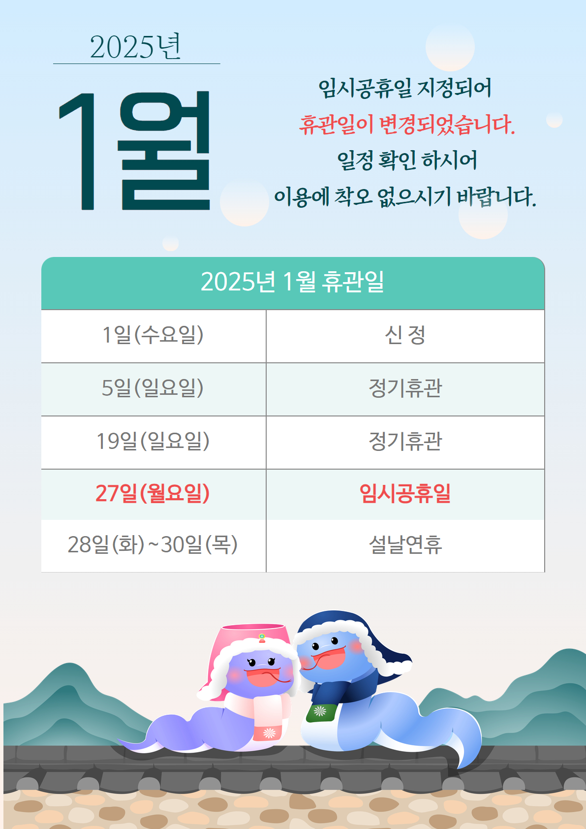 오산스포츠센터 오산스포츠센터 2025년 1월 휴관일 안내(수정게시) 작성자 osansisul03 등록일자 2025년 1월 10일 10시 32분 48초 조회 1,535 2025년 1월(수정).jpg [ Size : 893.48KB , Down : 1,924 ] 미리보기 다운로드 목록보기
