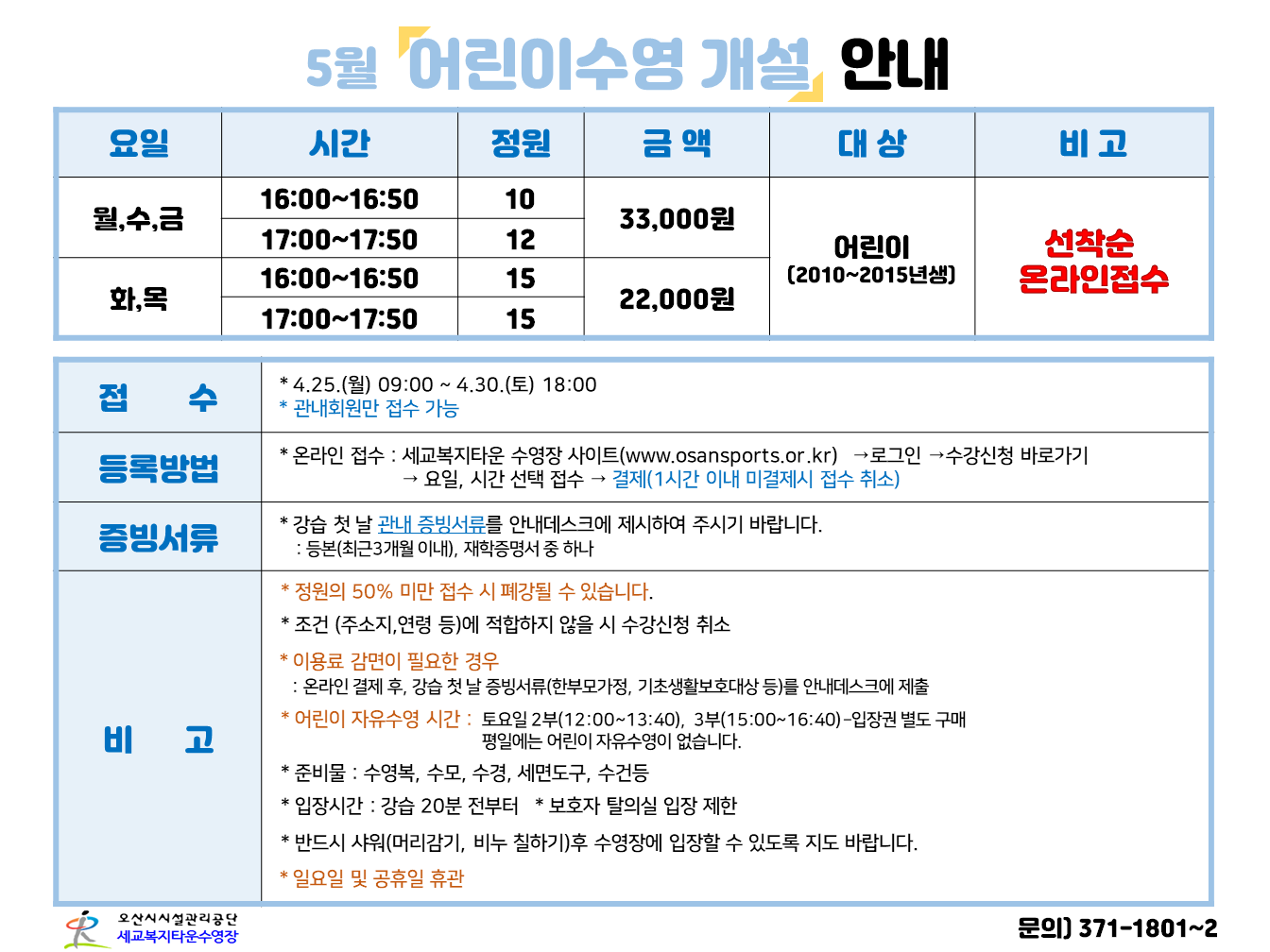 세교복지타운 수영장 5월 어린이수영 개설 안내 작성자 osansisul01 등록일자 2022년 4월 20일 20시 7분 44초 조회 846 어린이수영 홍보물(2022.05).png [ Size : 167.56KB , Down : 282 ] 미리보기 다운로드 목록보기