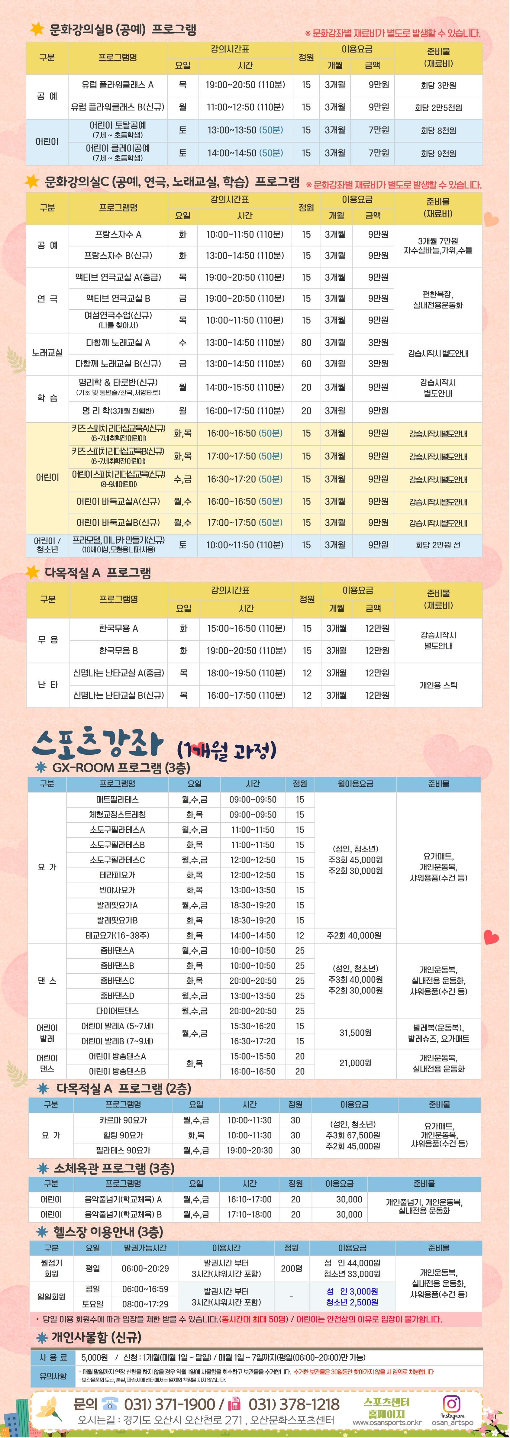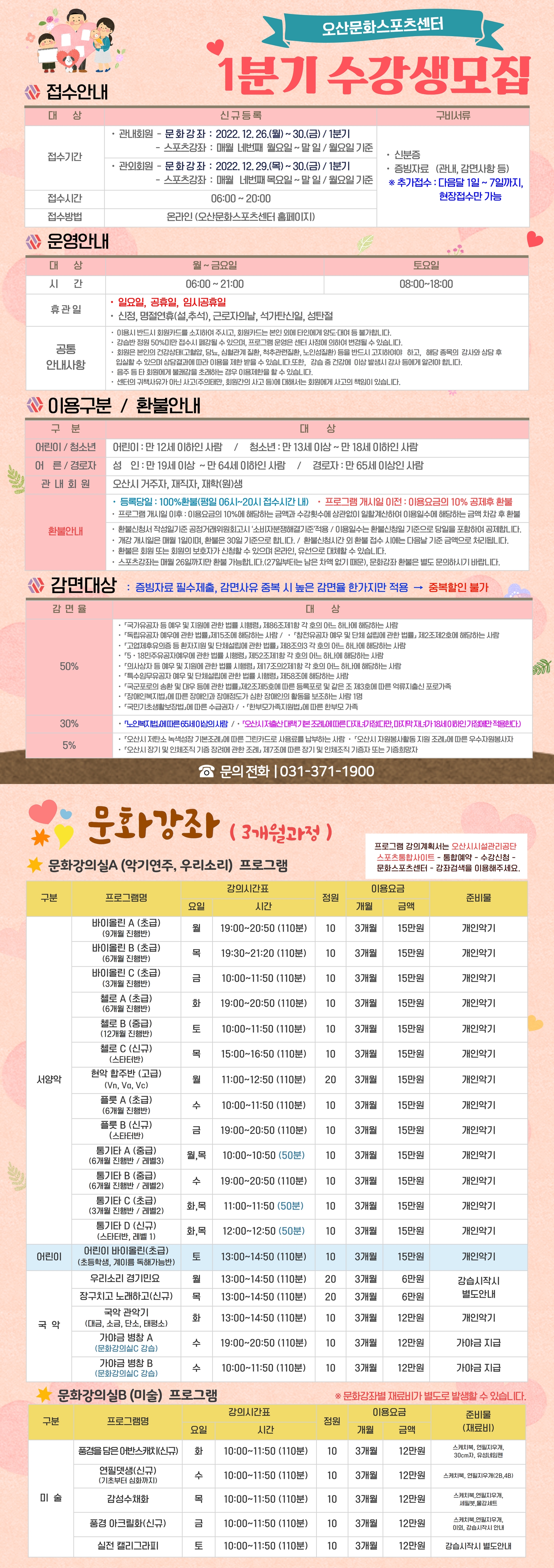 오색문화체육센터 오산문화스포츠센터 2023년 1분기(1월) 회원 모집 안내