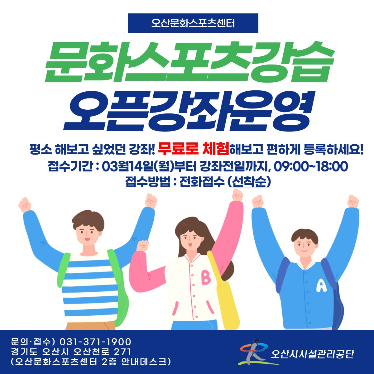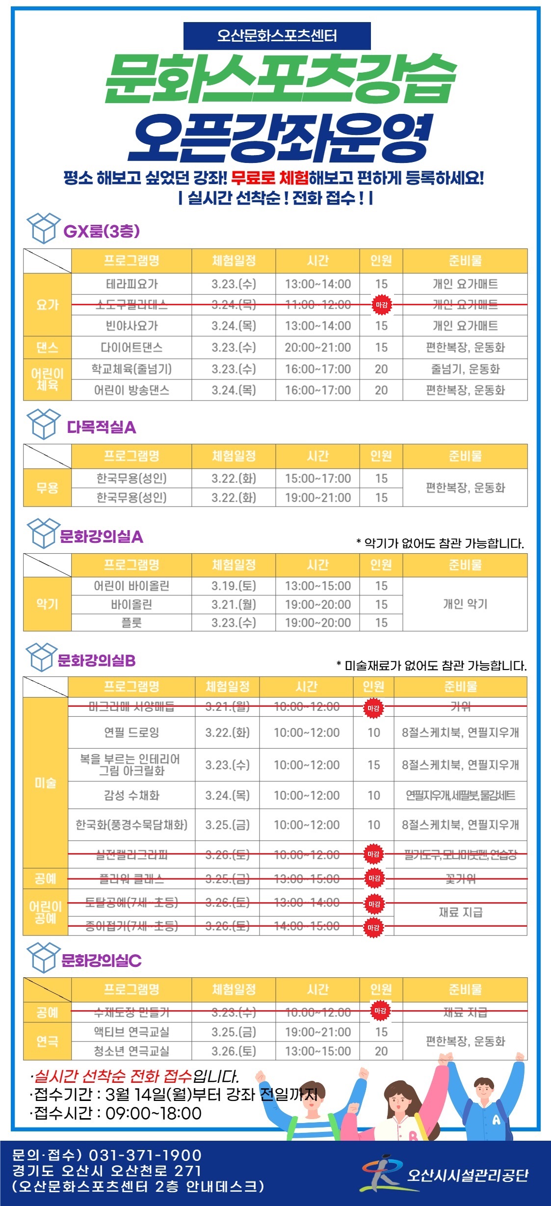 오색문화체육센터 오산문화스포츠센터 공개강좌 운영 안내_3월17일(목), 18시 기준 작성자 허슬기 등록일자 2022년 3월 14일 18시 26분 42초 조회 1,939 공개강좌.png [ Size : 1.01MB , Down : 247 ] 미리보기 다운로드 01. 문화스포츠 오픈강좌 포스터(최종 - 4일차 마감).jpg [ Size : 682KB , Down : 197 ] 미리보기 다운로드 목록보기