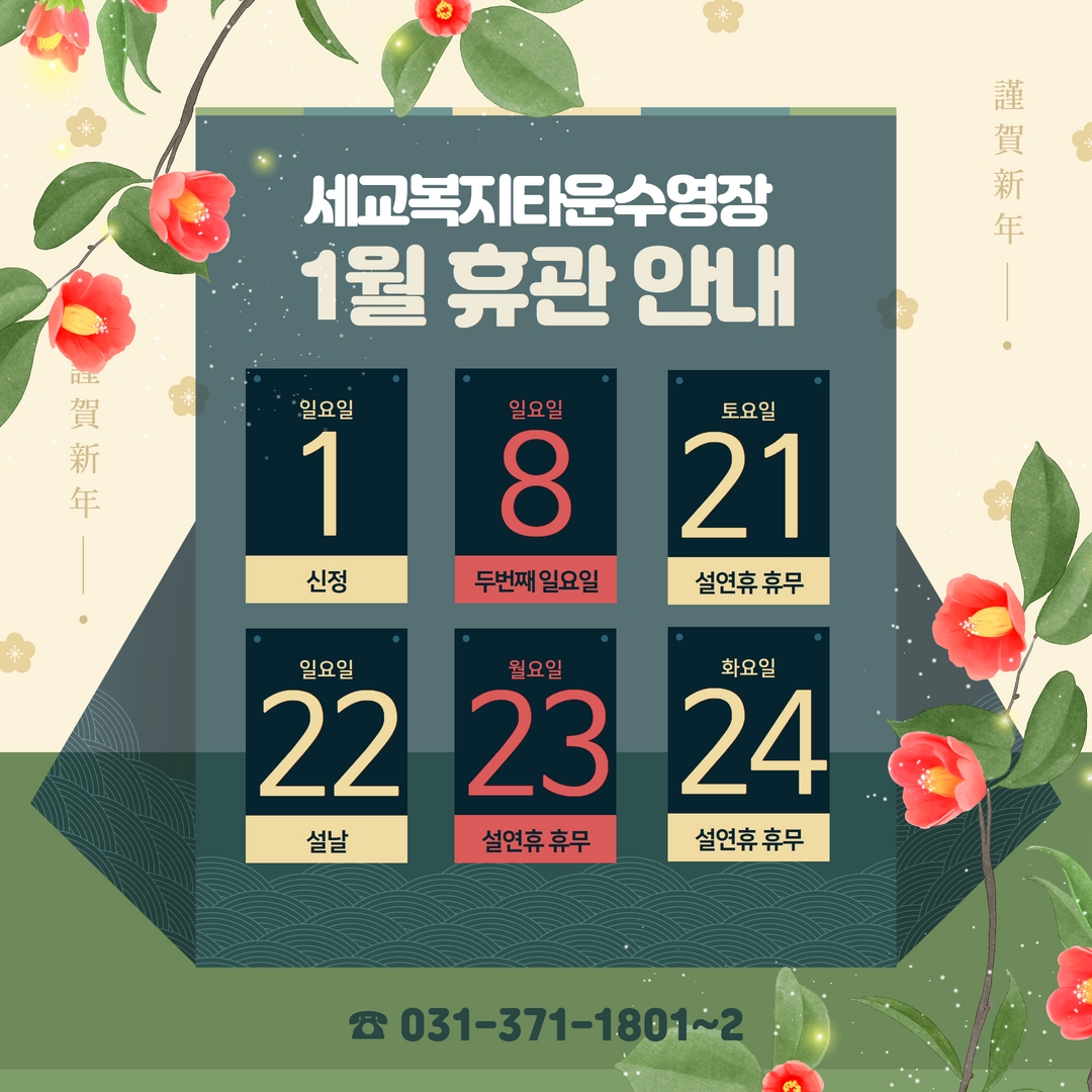 세교복지타운 수영장 1월 휴관일 안내 작성자 osansisul01 등록일자 2022년 12월 27일 15시 26분 15초 조회 315 1월 휴무.jpg [ Size : 477.76KB , Down : 345 ] 미리보기 다운로드 목록보기