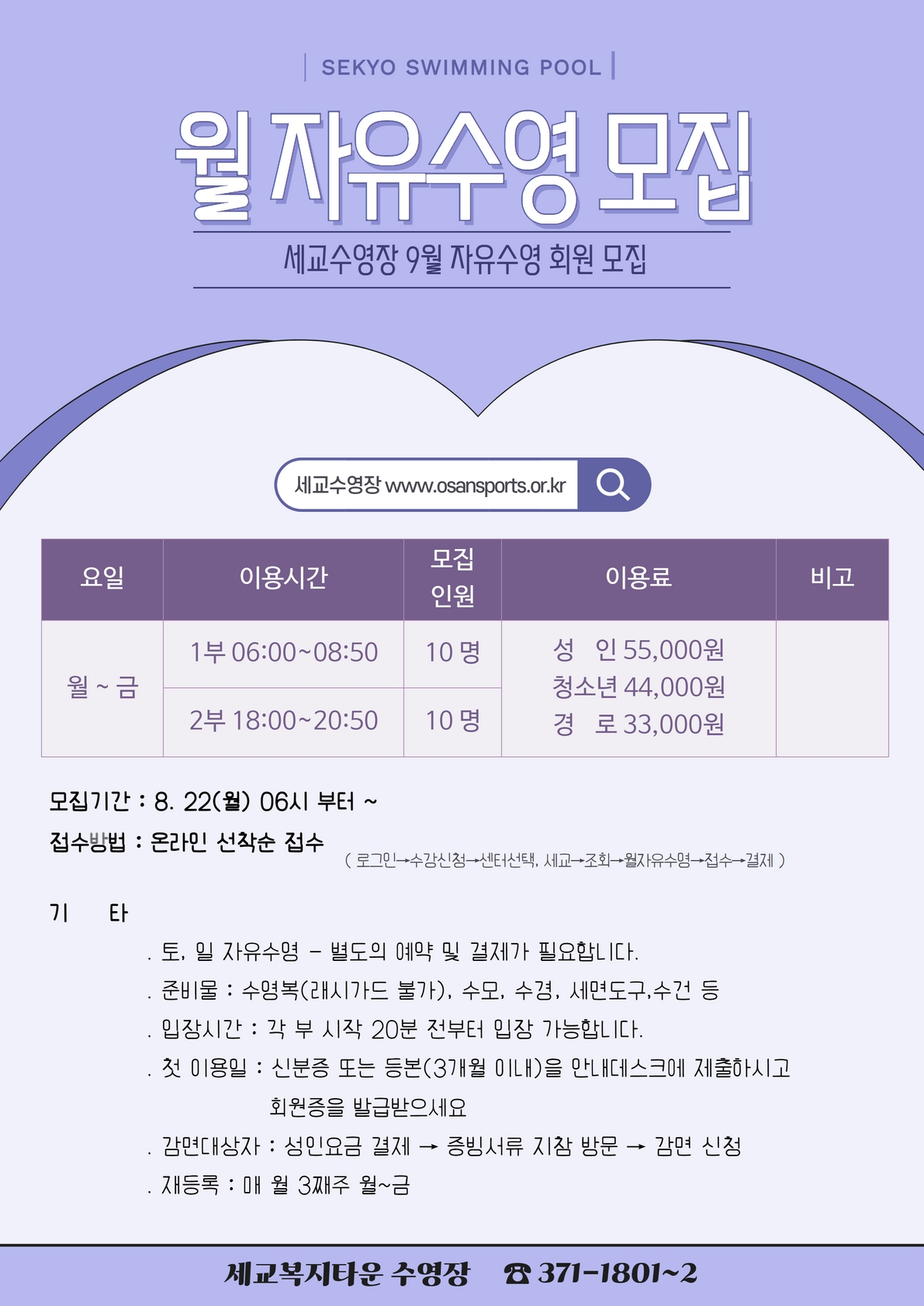 세교복지타운 수영장 9월 월정기 자유수영 모집안내 작성자 osansisul01 등록일자 2022년 8월 17일 14시 31분 13초 조회 930 월정기 자유수영.jpg [ Size : 452.38KB , Down : 1,081 ] 미리보기 다운로드 목록보기