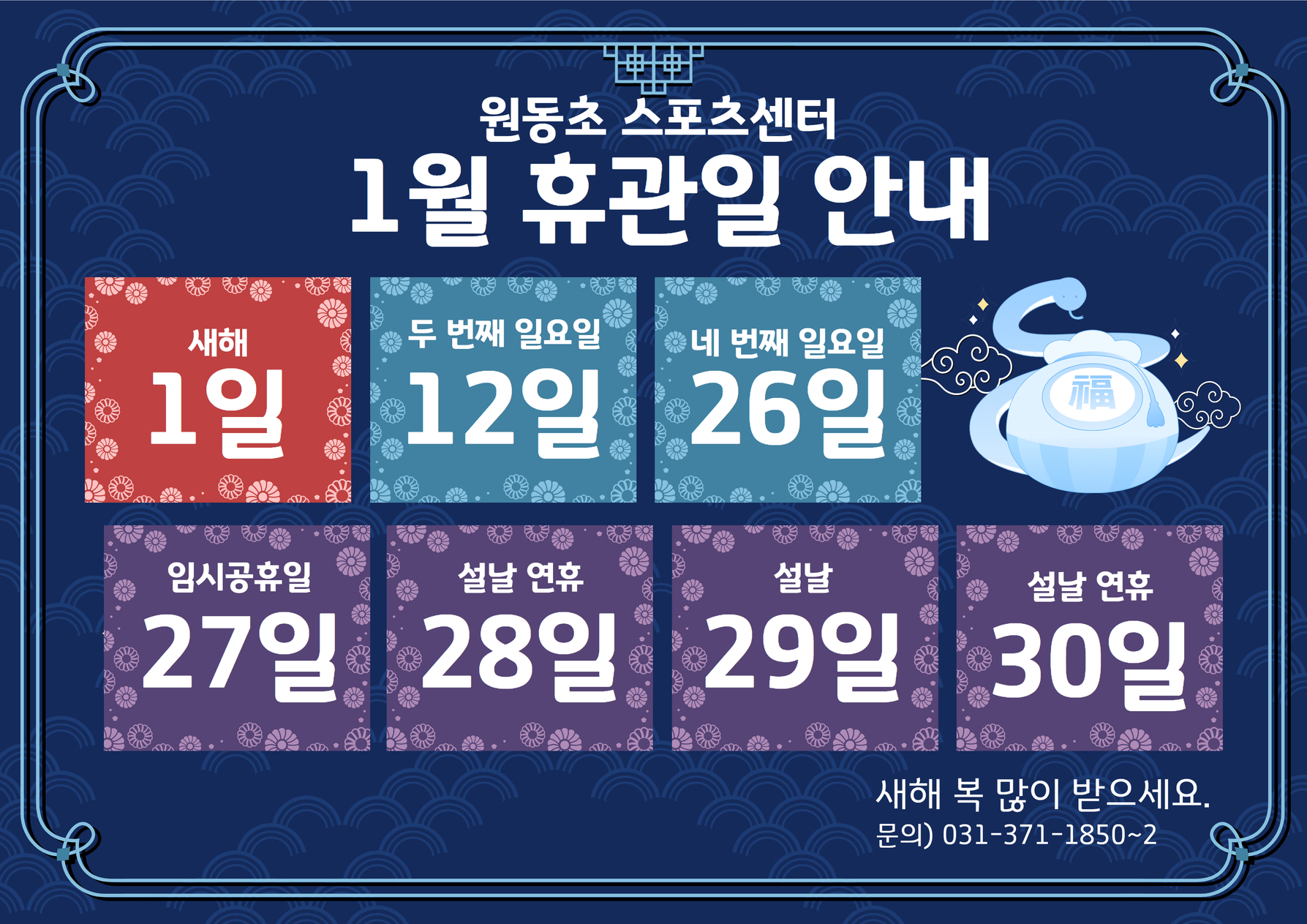 원동초 스포츠센터 [원동] 2025년 1월 휴관 안내 (임시공휴일 추가) 작성자 osansisul02 등록일자 2024년 12월 26일 14시 41분 43초 조회 791 1월휴관일_원동초스포츠센터.jpg [ Size : 1.54MB , Down : 299 ] 미리보기 다운로드 목록보기