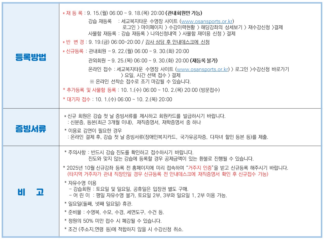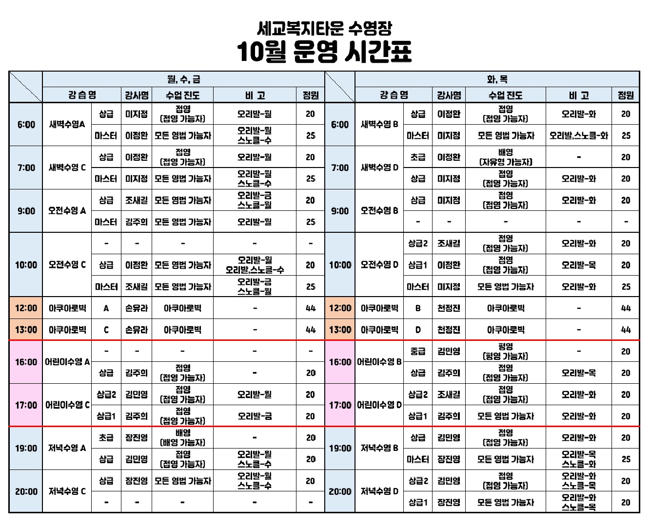 세교복지타운 수영장 [세교] 10월 강습진도표 작성자 osansisul01 등록일자 2025년 9월 11일 20시 5분 38초 조회 861 [세교]10월 진도표.jpg [ Size : 413.64KB , Down : 1,486 ] 미리보기 다운로드 25년 10월 수영 접수 안내문.jpg [ Size : 267.79KB , Down : 1,327 ] 미리보기 다운로드 목록보기