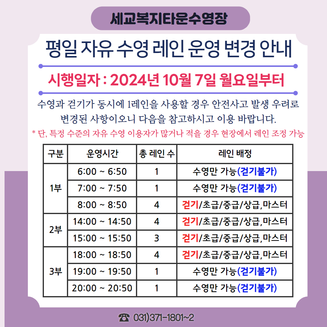 세교복지타운 수영장 [세교] 평일 자유수영 레인 운영 변경 안내(걷기레인 지정) 작성자 osansisul01 등록일자 2024년 9월 2일 10시 46분 27초 조회 637 걷기레인.jpg [ Size : 686.84KB , Down : 685 ] 미리보기 다운로드 목록보기