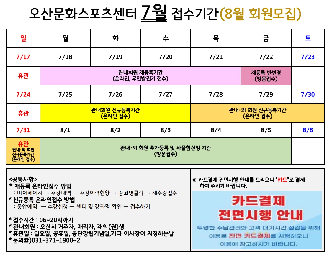 오색문화체육센터 오산문화스포츠센터 7월 접수기간(2022. 8월 강좌)_수정 작성자 허슬기 등록일자 2022년 7월 11일 11시 26분 16초 조회 1,186 . 7월회원모집(8월강좌).jpg [ Size : 398.14KB , Down : 1,507 ] 미리보기 다운로드 목록보기