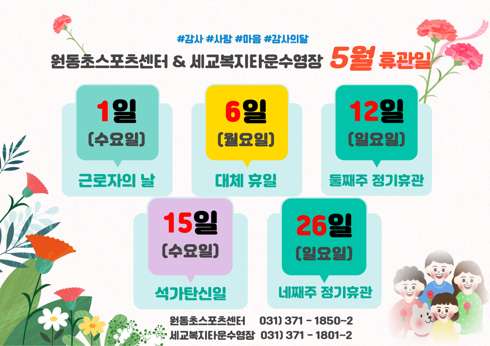 세교복지타운 수영장 [원동],[세교] 5월 휴관일 안내 작성자 osansisul02 등록일자 2024년 4월 17일 15시 53분 21초 조회 1,189 5월 휴관일 안내.jpg [ Size : 596.01KB , Down : 1,401 ] 미리보기 다운로드 목록보기