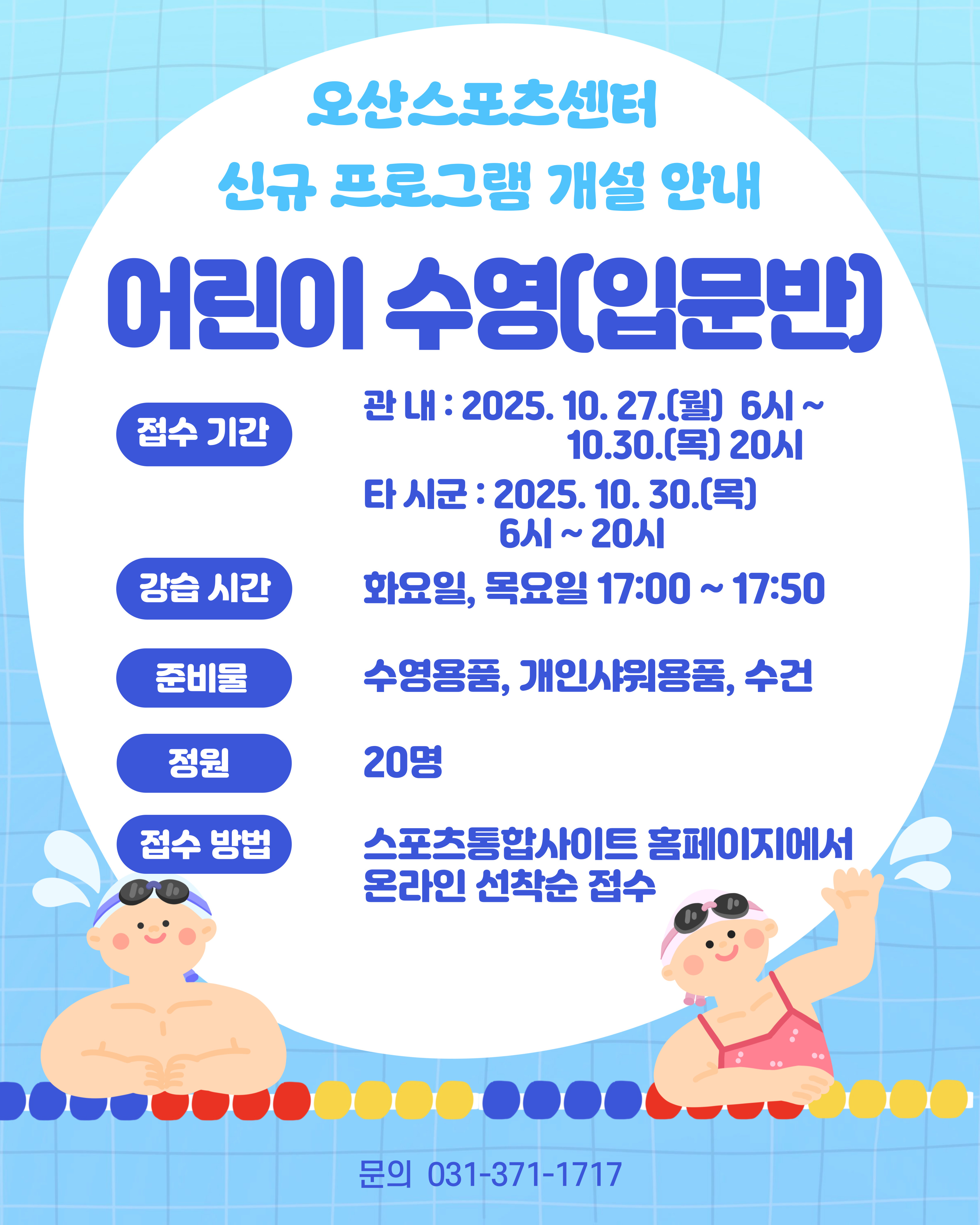 공지 오산스포츠센터 [오산스포츠센터] 11월 어린이수영 신규입문반 개설 작성자 osansisul03 등록일자 2025년 10월 22일 15시 29분 42초 조회 980 11월 신규반.jpg [ Size : 1.26MB , Down : 1,273 ] 미리보기 다운로드 목록보기