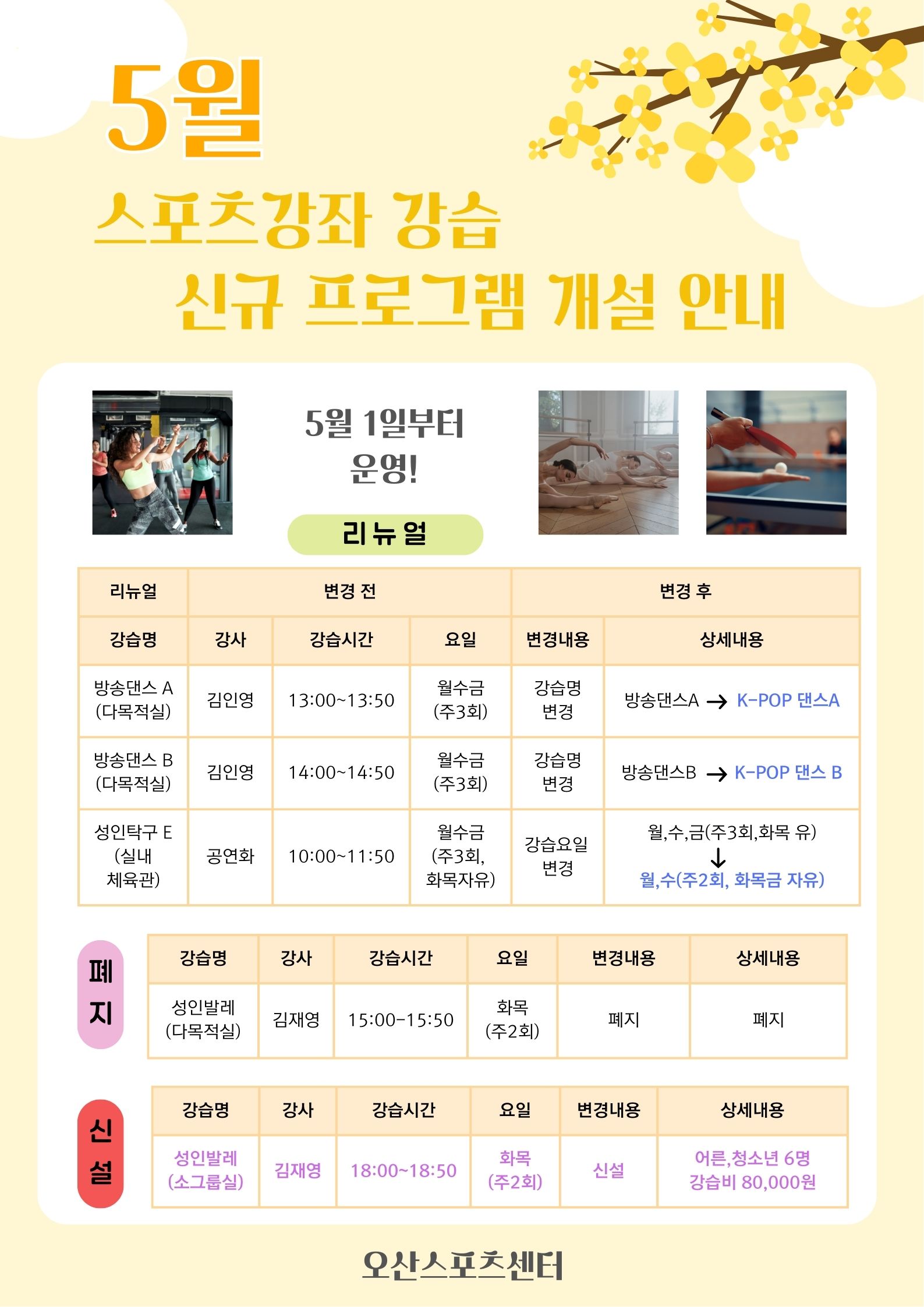 오산스포츠센터 오산스포츠센터 2025년 5월 스포츠강좌 강습 신규프로그램 개설 안내 작성자 osansisul03 등록일자 2025년 4월 9일 13시 34분 6초 조회 1,545 노란색과 흰색 일러스트 이달의 추천도서 포스터.jpg [ Size : 307.04KB , Down : 2,012 ] 미리보기 다운로드 목록보기