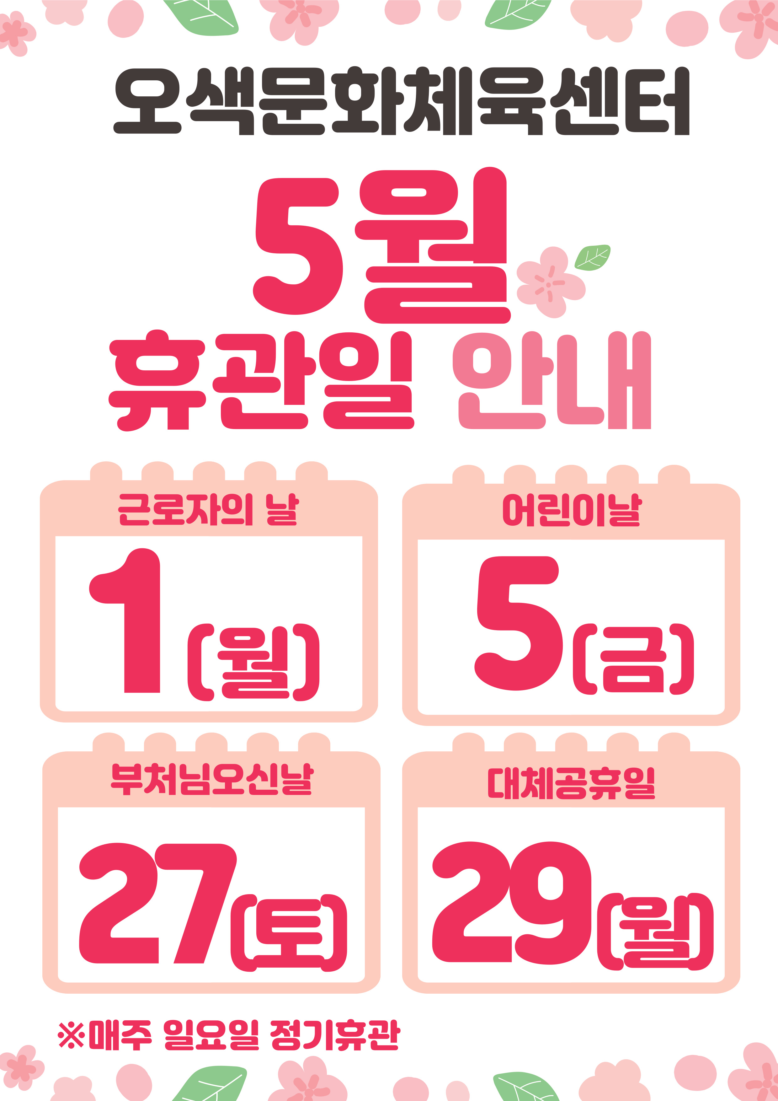 오색문화체육센터 오색문화체육센터 4월 접수기간(2023. 5월 강좌) 작성자 osansisul04 등록일자 2023년 4월 13일 11시 6분 47초 조회 652 . 2023.4월접수기간(5월강좌).png [ Size : 178.69KB , Down : 995 ] 미리보기 다운로드 5월휴관(3).jpg [ Size : 653.52KB , Down : 93 ] 미리보기 다운로드 목록보기