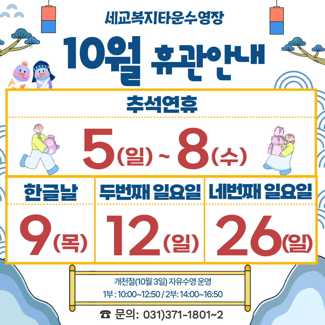 세교복지타운 수영장 [세교] 10월 휴관일 안내 작성자 osansisul01 등록일자 2025년 9월 25일 10시 28분 0초 조회 752 10월 휴관(한글날 추가).jpg [ Size : 657.16KB , Down : 924 ] 미리보기 다운로드 목록보기