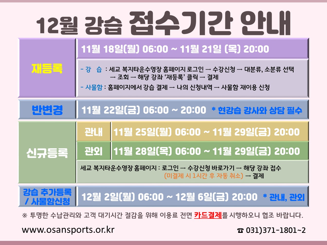 세교복지타운 수영장 [세교] 12월 강습 접수기간 안내 작성자 osansisul01 등록일자 2024년 11월 6일 14시 12분 41초 조회 757 12월 강습 접수기간 안내.jpg [ Size : 245.41KB , Down : 1,066 ] 미리보기 다운로드 목록보기