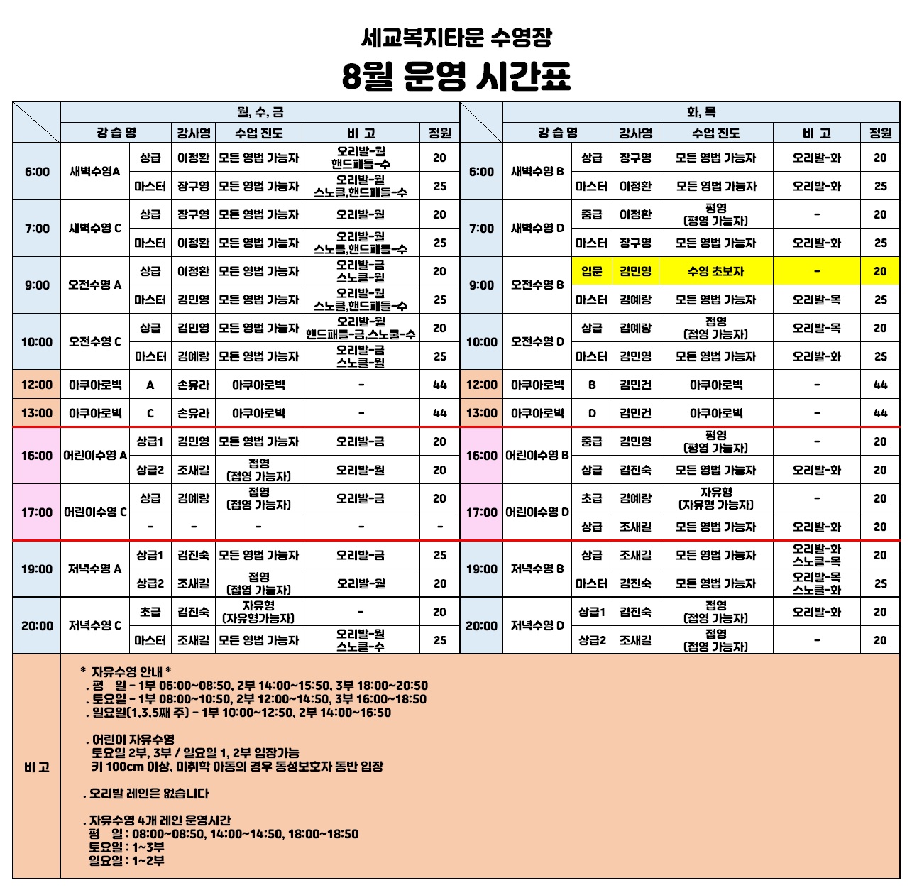 세교복지타운 수영장 [세교] 8월 강습 진도표 작성자 osansisul01 등록일자 2024년 7월 12일 14시 1분 20초 조회 825 8월 강습표1.jpg [ Size : 453.92KB , Down : 1,480 ] 미리보기 다운로드 24.8월 강습표2.jpg [ Size : 163.66KB , Down : 1,382 ] 미리보기 다운로드 목록보기