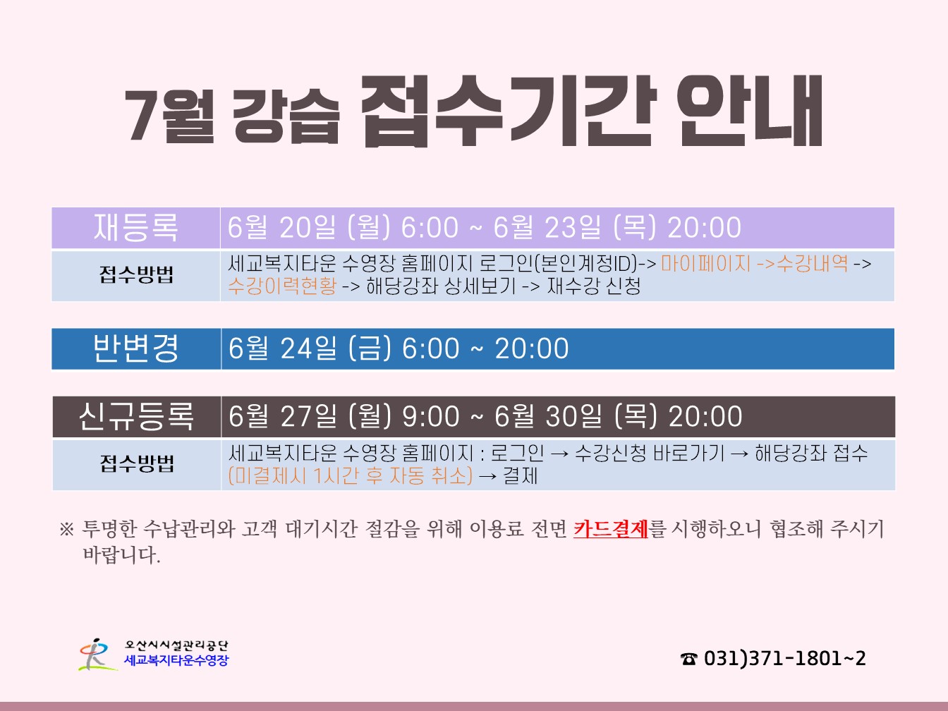 세교복지타운 수영장 7월 접수기간 안내 작성자 osansisul01 등록일자 2022년 6월 14일 10시 54분 9초 조회 833 22.7월 접수기간 안내.jpg [ Size : 174.99KB , Down : 254 ] 미리보기 다운로드 목록보기