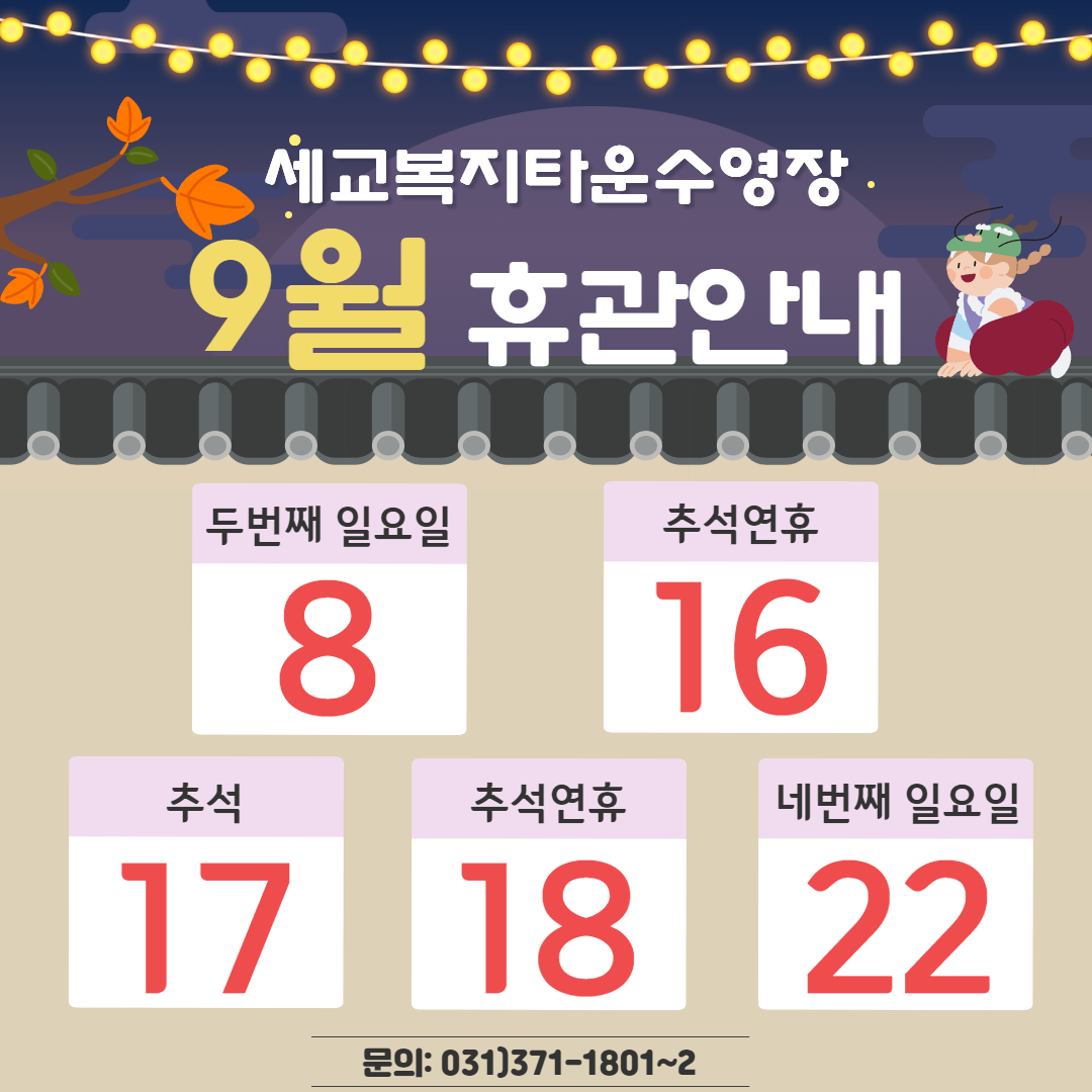 세교복지타운 수영장 [세교] 9월 휴관 안내 작성자 osansisul01 등록일자 2024년 8월 28일 16시 40분 14초 조회 731 9월 휴관안내.jpg [ Size : 508.5KB , Down : 848 ] 미리보기 다운로드 목록보기