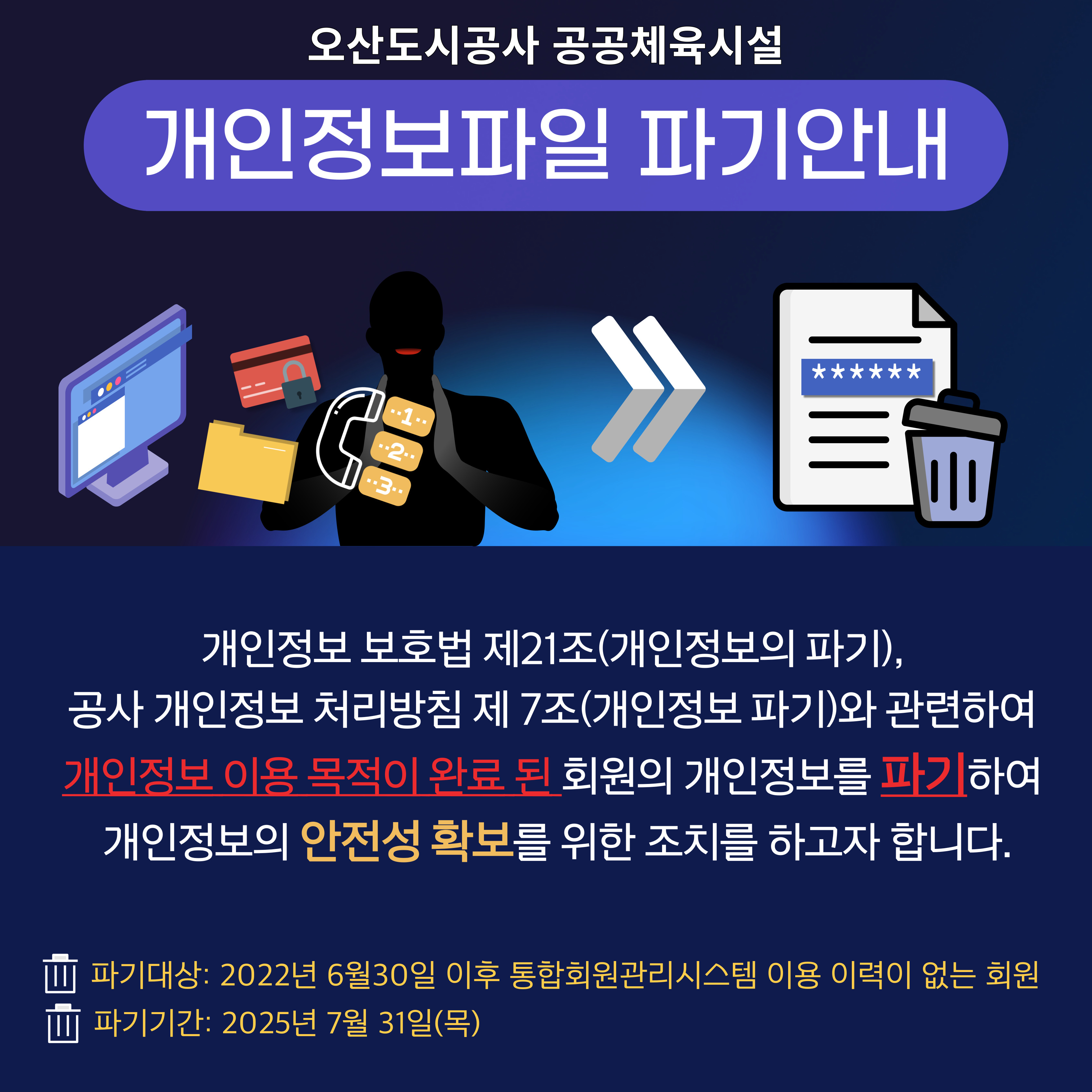 공지 공통 오산도시공사 공공체육시설 개인정보파일 파기안내 작성자 osansisul01 등록일자 2025년 7월 1일 10시 14분 33초 조회 531 개인정보파일 파기안내.jpg [ Size : 1.06MB , Down : 466 ] 미리보기 다운로드 목록보기
