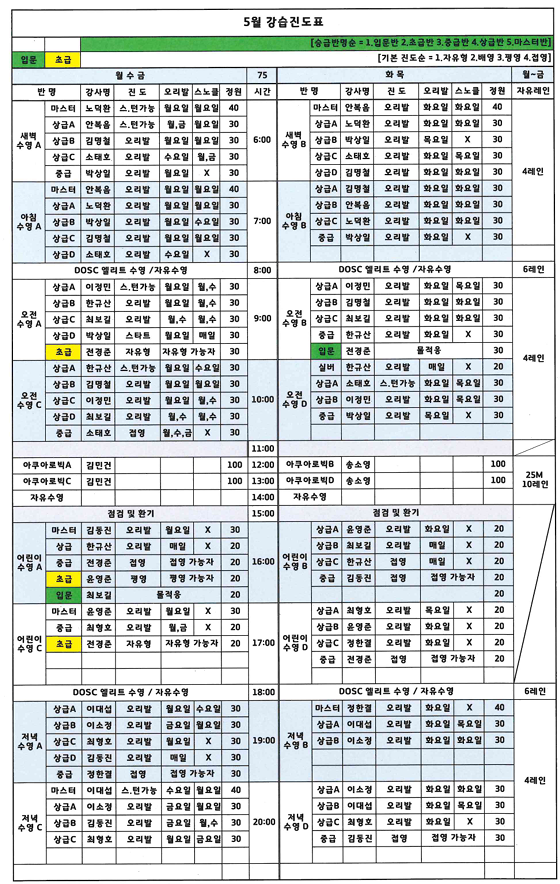 오산스포츠센터 [오산스포츠센터] 2025년 5월 강습 진도표 작성자 osansisul03 등록일자 2025년 4월 14일 17시 23분 46초 조회 3,135 5월.png [ Size : 635.9KB , Down : 5,580 ] 미리보기 다운로드 목록보기