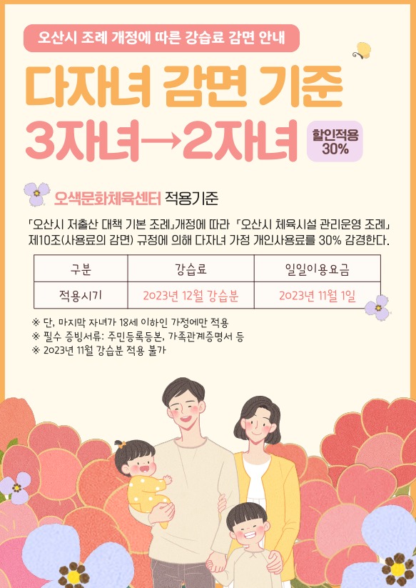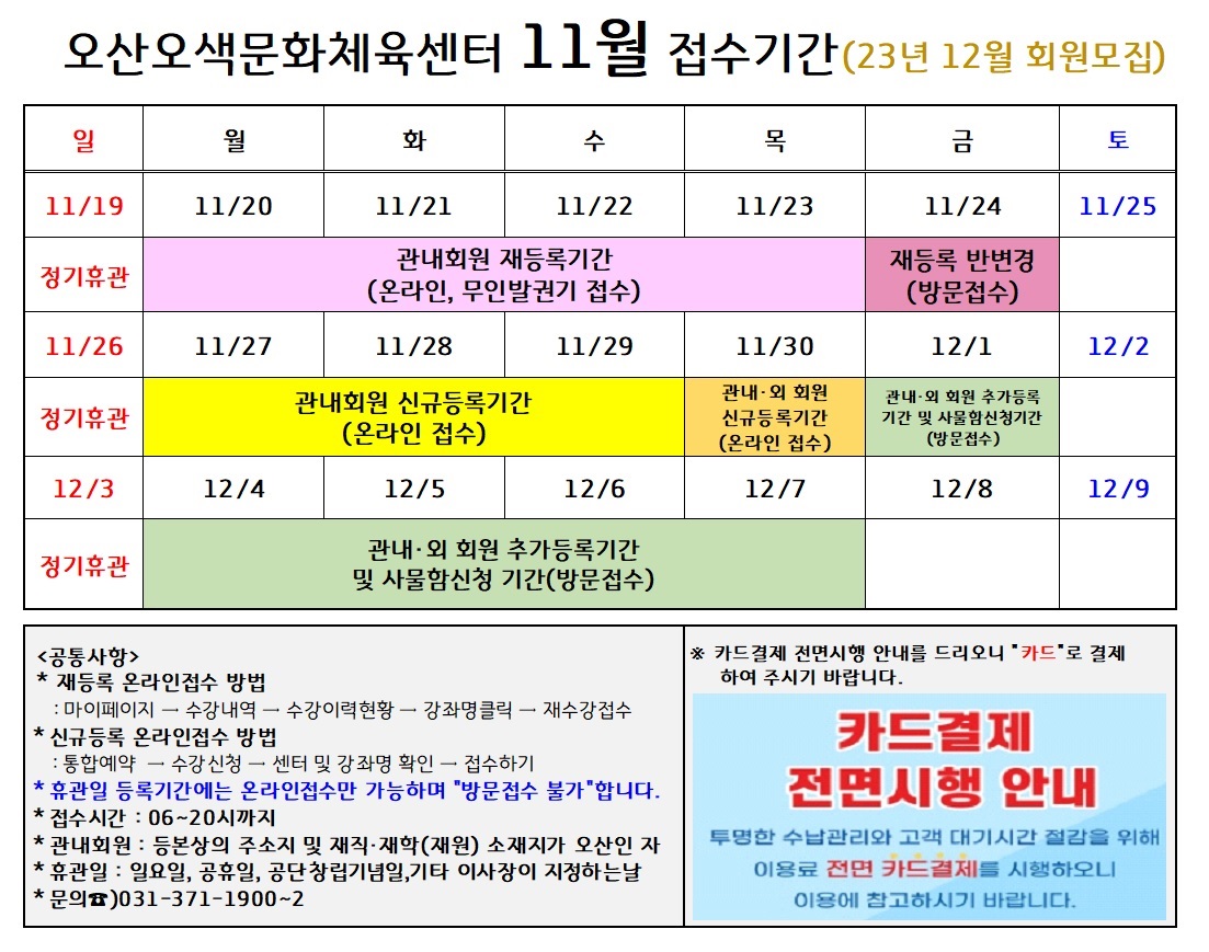 오색문화체육센터 오산오색문화체육센터 11월 접수기간(2023. 12월 강좌) 작성자 osansisul04 등록일자 2023년 11월 7일 16시 22분 18초 조회 1,285 . 2023.11월접수기간(12월 강좌).jpg [ Size : 282.49KB , Down : 2,452 ] 미리보기 다운로드 다자녀감면기준(오색문화).jpeg [ Size : 122.17KB , Down : 2,200 ] 미리보기 다운로드 목록보기