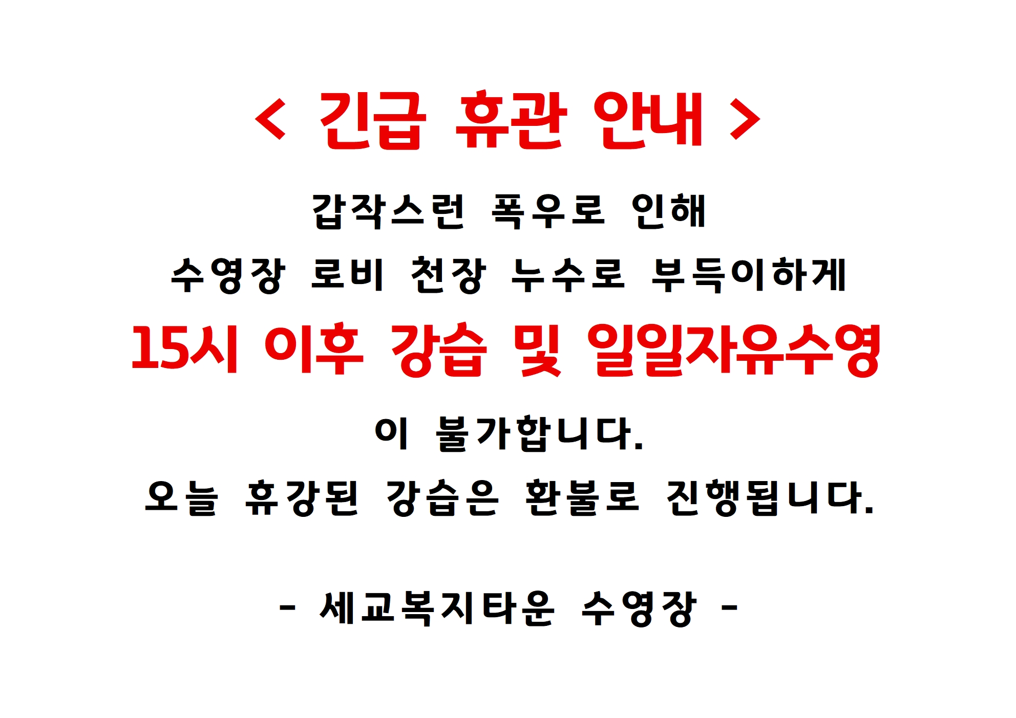 세교복지타운 수영장 [세교] 9월16일(화) 긴급 휴관 안내(15시~) 작성자 osansisul01 등록일자 2025년 9월 16일 15시 12분 21초 조회 648 긴급 휴관 안내.jpg [ Size : 447.21KB , Down : 707 ] 미리보기 다운로드 목록보기