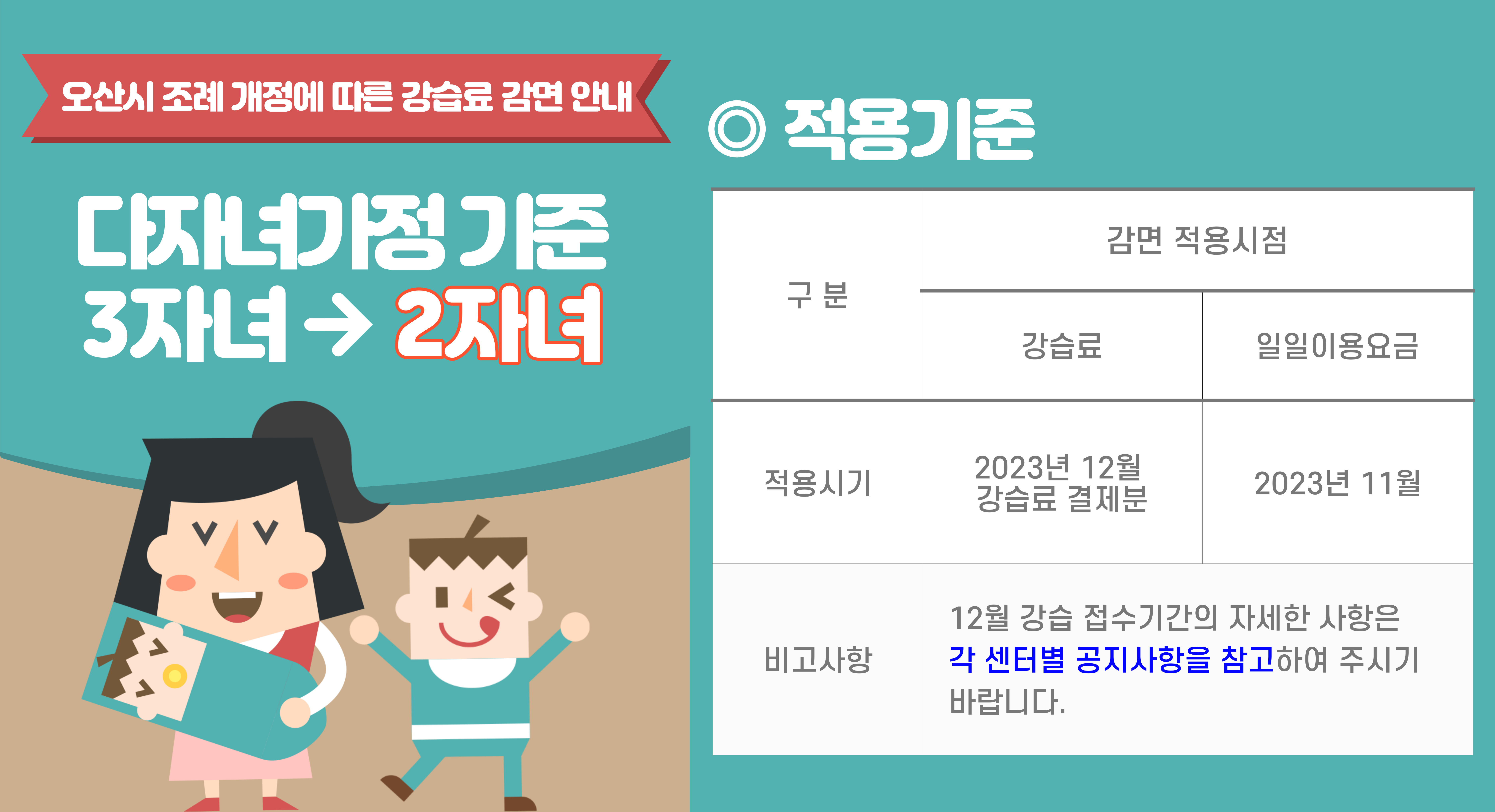공통 오산시 조례 개정에 따른 강습료 감면 안내(다자녀가정 기준 조정) 작성자 osansisul04 등록일자 2023년 10월 27일 10시 16분 7초 조회 2,643 . 다자녀감면조정(2자녀)2.jpg [ Size : 1.22MB , Down : 4,855 ] 미리보기 다운로드 목록보기