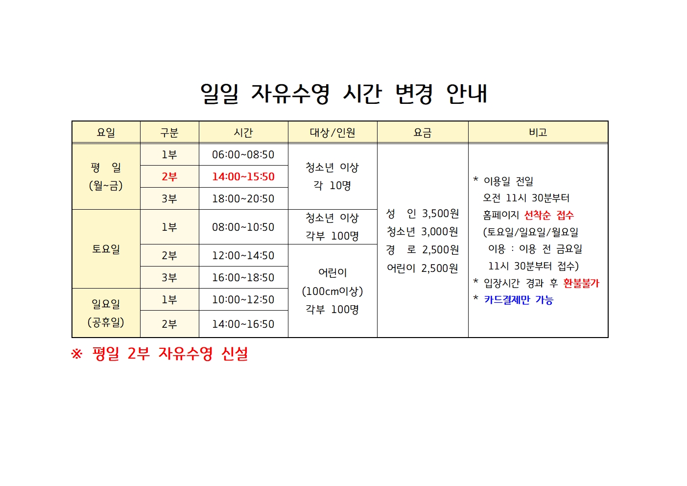 원동초 스포츠센터 원동초 스포츠센터 자유수영 시간 변경 알림 작성자 osansisul02 등록일자 2022년 8월 31일 9시 32분 2초 조회 644 일일 자유수영 시간 변경 안내001.jpg [ Size : 300.29KB , Down : 842 ] 미리보기 다운로드 목록보기