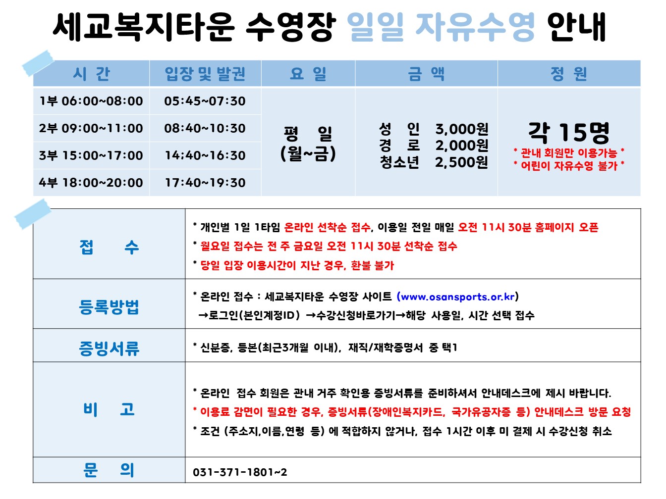 세교복지타운 수영장 일일 자유수영 이용 안내 작성자 세교센터관리자 등록일자 2021년 4월 13일 16시 22분 30초 조회 530 슬라이드1.JPG [ Size : 255.56KB , Down : 163 ] 미리보기 다운로드 목록보기