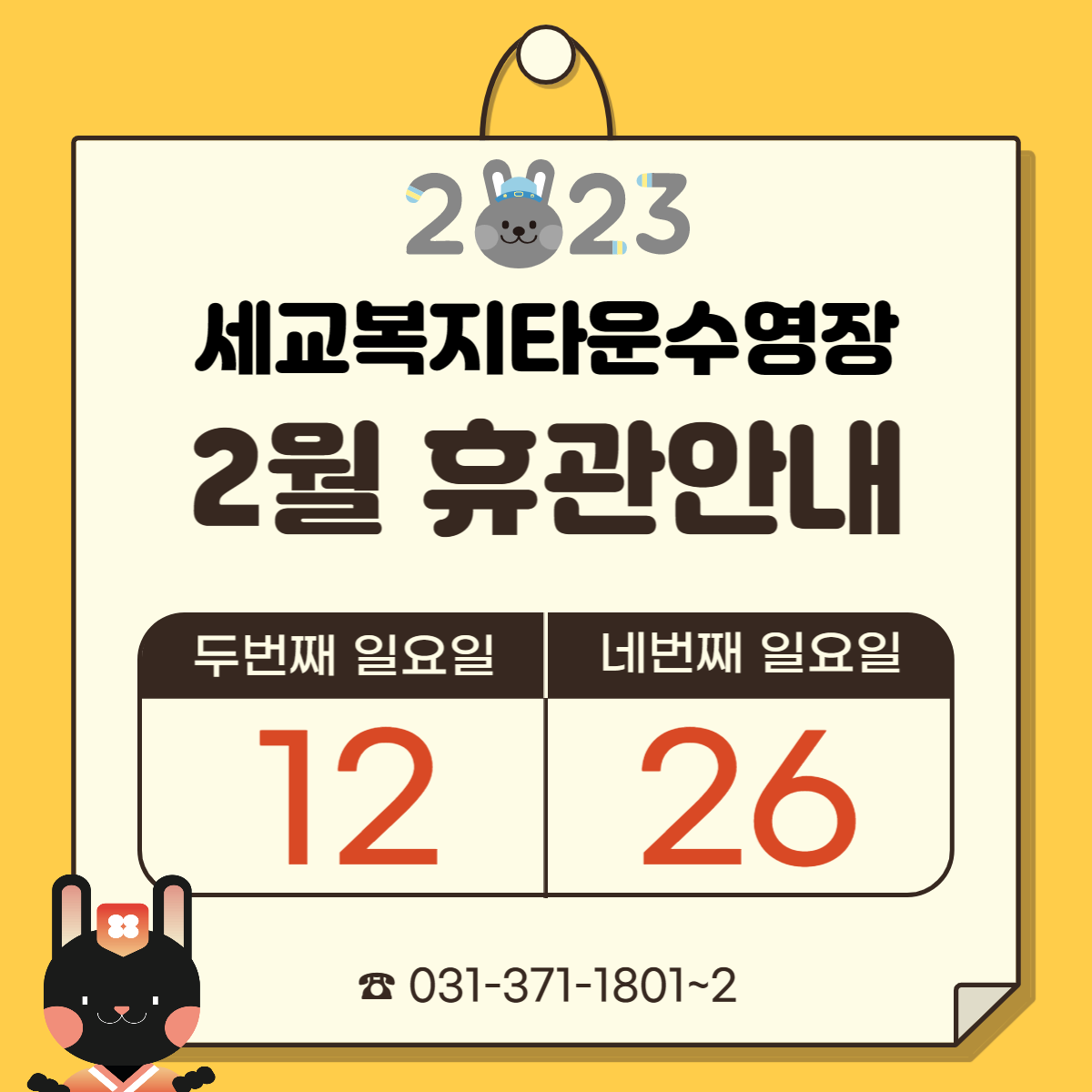 세교복지타운 수영장 2월 휴관일 안내 작성자 osansisul01 등록일자 2023년 2월 3일 13시 27분 10초 조회 331 2월 휴관.png [ Size : 161.61KB , Down : 582 ] 미리보기 다운로드 목록보기