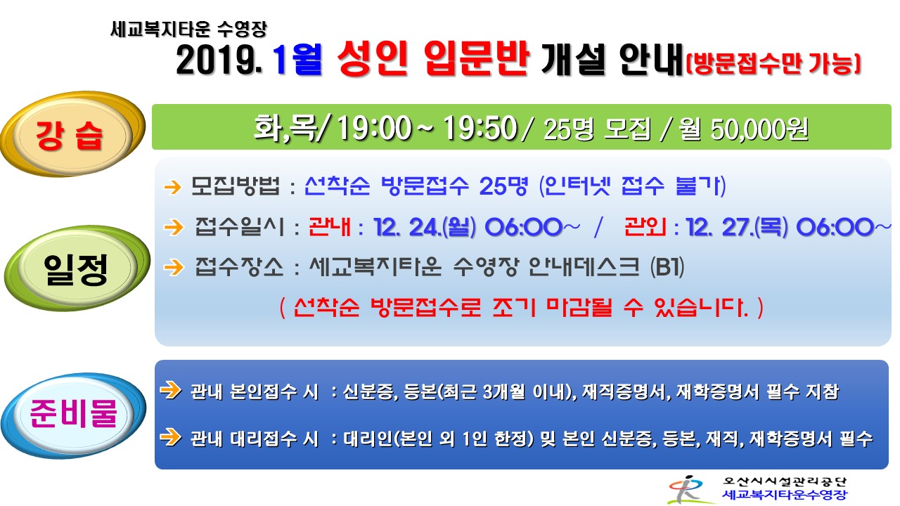 세교복지타운 수영장 2019.1월 성인 입문반 개설 안내 작성자 세교센터관리자 등록일자 2018년 12월 19일 9시 50분 31초 조회 733 6.성인 입문반 개설 안내.jpg [ Size : 200.86KB , Down : 138 ] 미리보기 다운로드 목록보기