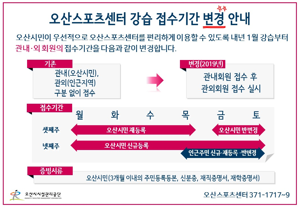 오산스포츠센터 오산시시설관리공단 강습 접수기간 변경 안내 작성자 최고관리자 등록일자 2018년 11월 19일 21시 8분 21초 조회 3,366 접수기간 변경안내.png [ Size : 463.55KB , Down : 202 ] 미리보기 다운로드 목록보기