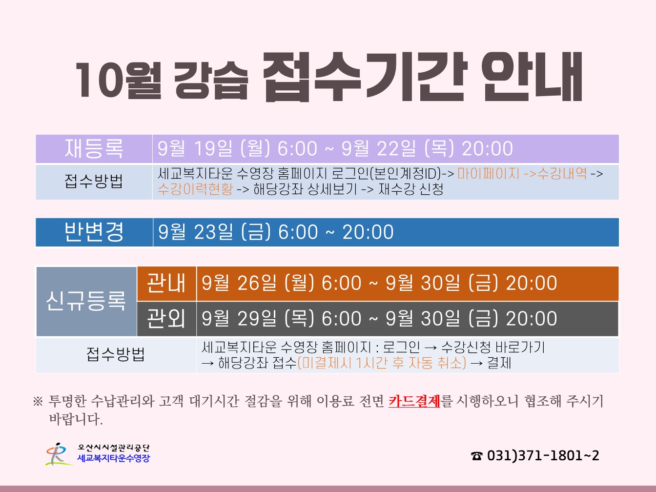 세교복지타운 수영장 10월 강습 접수기간 안내 작성자 osansisul01 등록일자 2022년 8월 30일 14시 2분 36초 조회 577 22.10월 접수기간 안내.jpg [ Size : 202.79KB , Down : 799 ] 미리보기 다운로드 목록보기