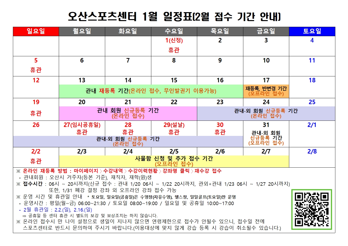 오산스포츠센터 오산스포츠센터 2025년 1월 일정표(2월 접수기간안내)(수정게시) 작성자 osansisul03 등록일자 2025년 1월 10일 10시 31분 13초 조회 1,833 오산스포츠센터 1월 일정표(2월 접수 기간 안내)수정.jpg [ Size : 649.94KB , Down : 2,775 ] 미리보기 다운로드 목록보기