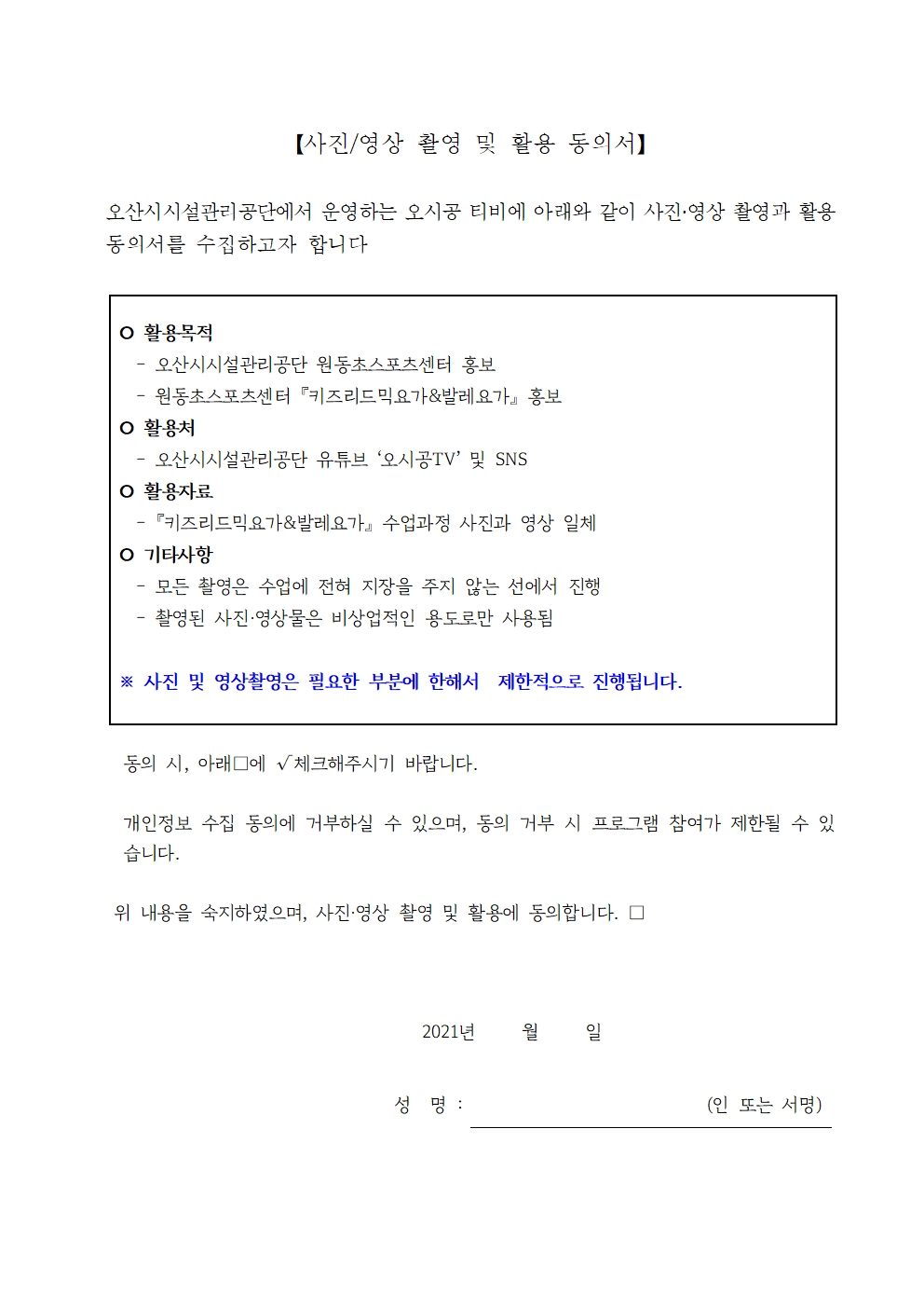오산시시설관리공단 원동초스포츠센터에서 귀하의 자녀가 수강중인 ‘키즈리드믹요가&발레요가’의 홍보 및 부모님들의 본 수업에 대한 궁금증을 해소하기 위해 사진 및 동영상을 촬영하여