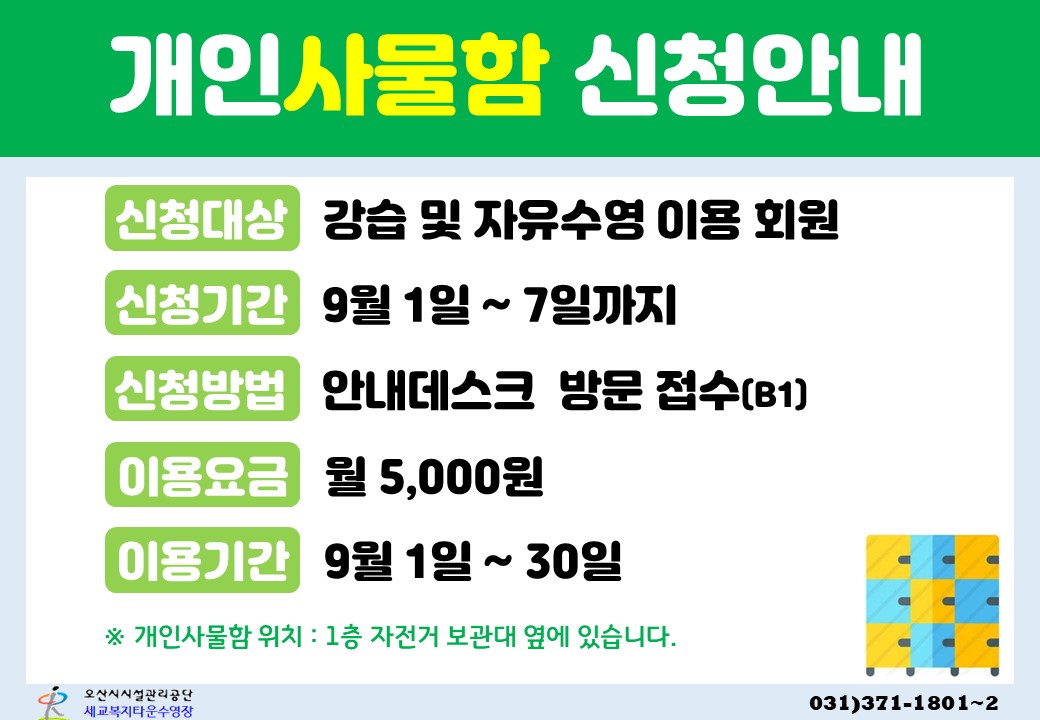 세교복지타운 수영장 9월 개인사물함 신청 안내 작성자 osansisul01 등록일자 2023년 8월 29일 10시 28분 37초 조회 396 9월 개인사물함.jpg [ Size : 129.08KB , Down : 901 ] 미리보기 다운로드 목록보기