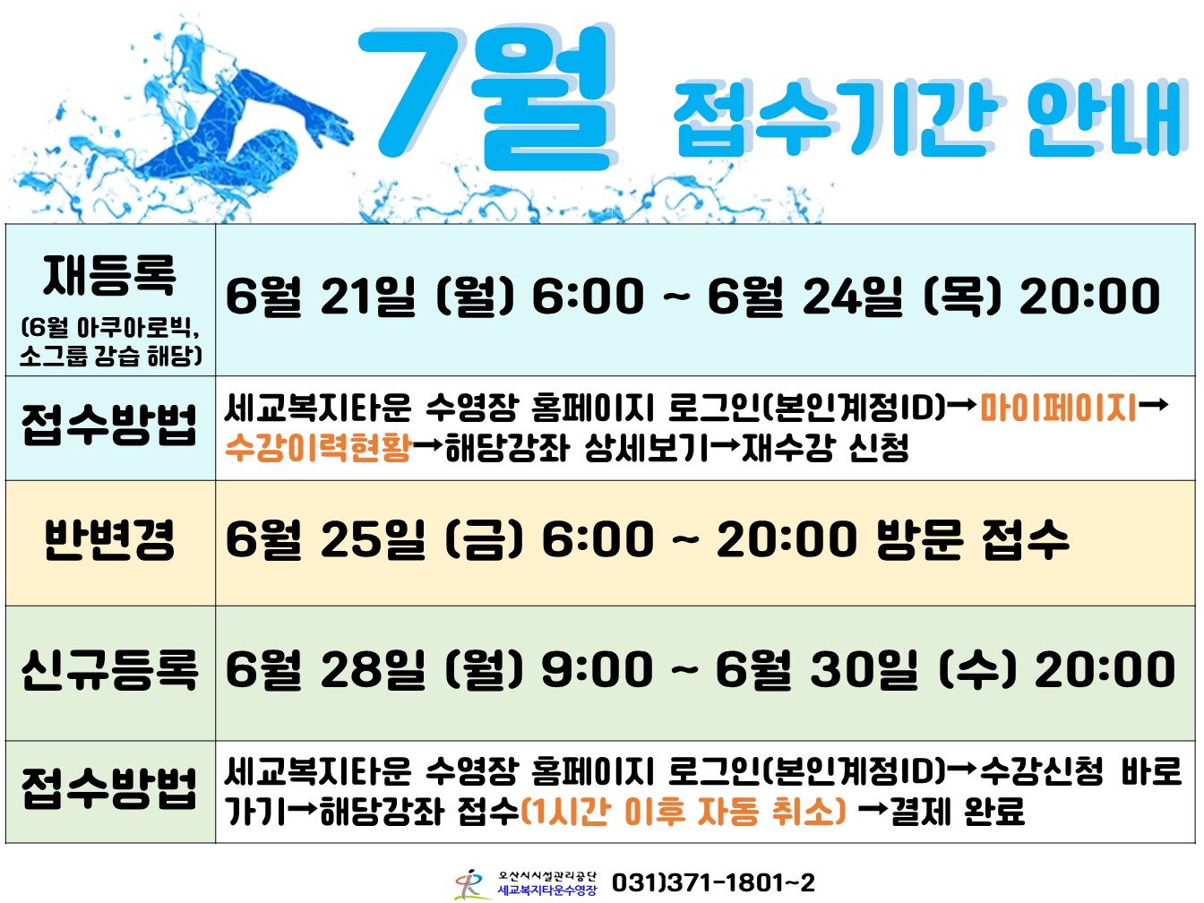 세교복지타운 수영장 7월 접수기간 안내 작성자 세교센터관리자 등록일자 2021년 6월 15일 13시 20분 50초 조회 608 7월 접수기간 안내.jpg [ Size : 280.87KB , Down : 156 ] 미리보기 다운로드 목록보기