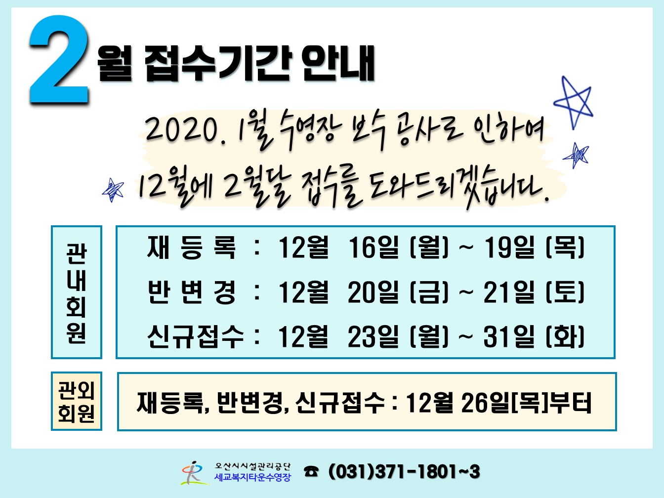 세교복지타운 수영장 2월 접수기간 안내 작성자 세교센터관리자 등록일자 2019년 12월 12일 14시 7분 55초 조회 494 접수기간 안내문(게시용).jpg [ Size : 213.27KB , Down : 166 ] 미리보기 다운로드 목록보기