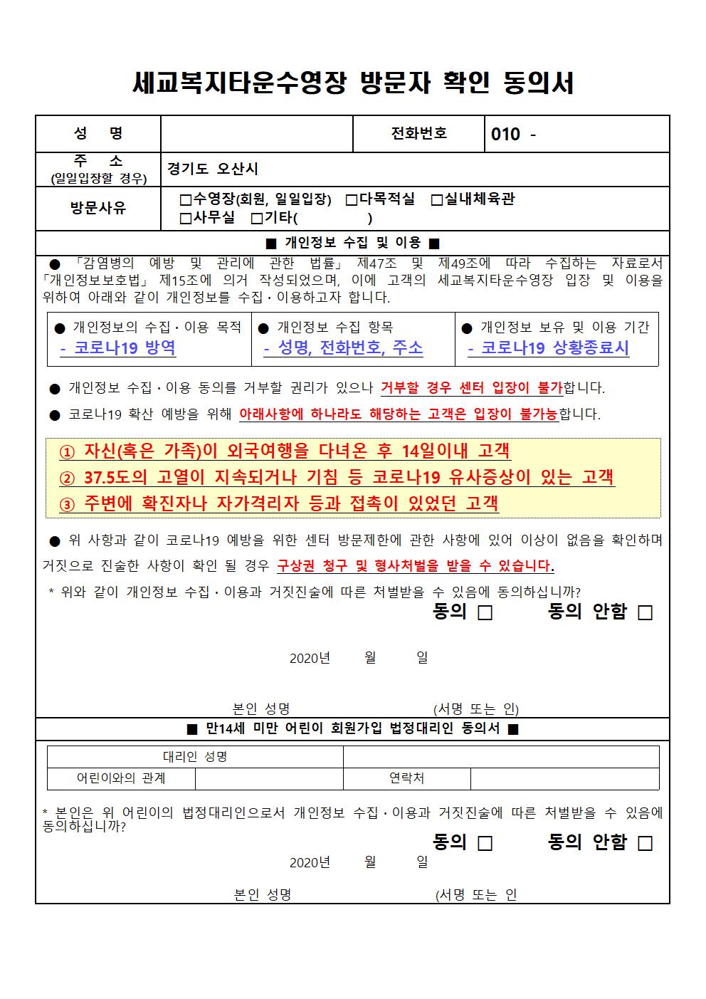 세교복지타운 수영장 세교복지타운수영장 방문자 확인 동의서 작성자 세교센터관리자 등록일자 2020년 4월 29일 15시 23분 23초 조회 1,110 세교복지타운수영장 방문 확인 동의서001.jpg [ Size : 207.69KB , Down : 225 ] 미리보기 다운로드 세교복지타운수영장 방문 확인 동의서.hwp [ Size : 16.5KB , Down : 289 ] 다운로드 목록보기