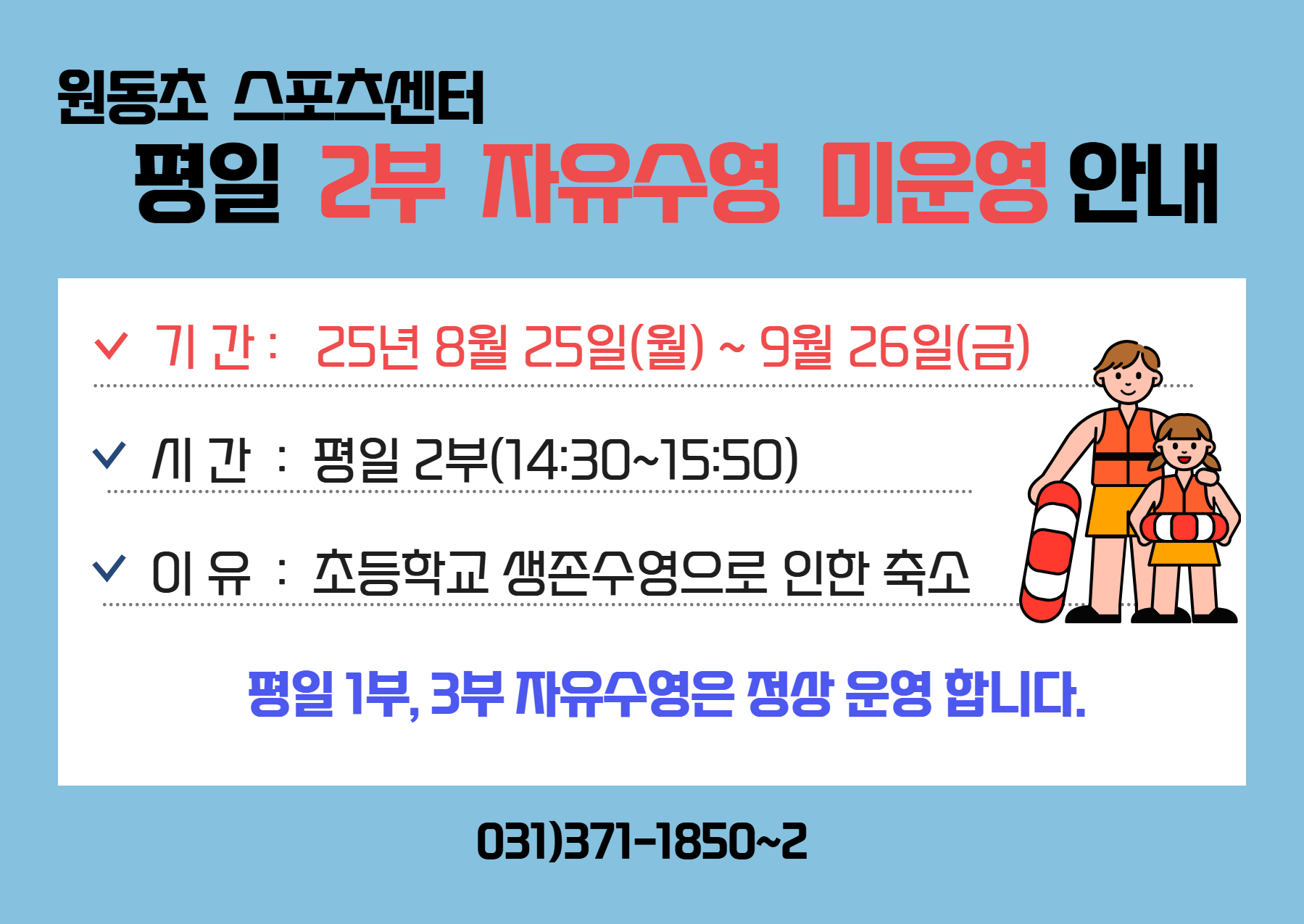 원동초 스포츠센터 [원동] 평일 2부 자유수영 미운영 안내 작성자 osansisul02 등록일자 2025년 8월 25일 14시 59분 3초 조회 653 생존수영 미운영_원동.jpg [ Size : 592.17KB , Down : 658 ] 미리보기 다운로드 목록보기