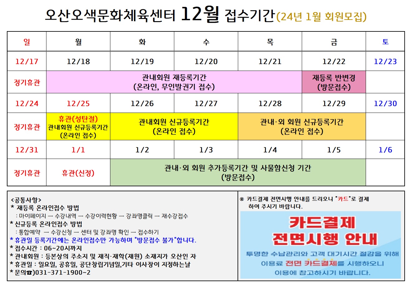 오색문화체육센터 오산오색문화체육센터 12월 접수기간(2024. 1월 강좌) 및 재등록(현장접수) 안내 작성자 osansisul04 등록일자 2023년 12월 18일 9시 52분 26초 조회 1,372 . 2023.12월접수기간(2024.1월 강좌).jpg [ Size : 320.17KB , Down : 2,428 ] 미리보기 다운로드 재등록현장접수,헬스장운영변경.jpg [ Size : 2.75MB , Down : 709 ] 미리보기 다운로드 목록보기