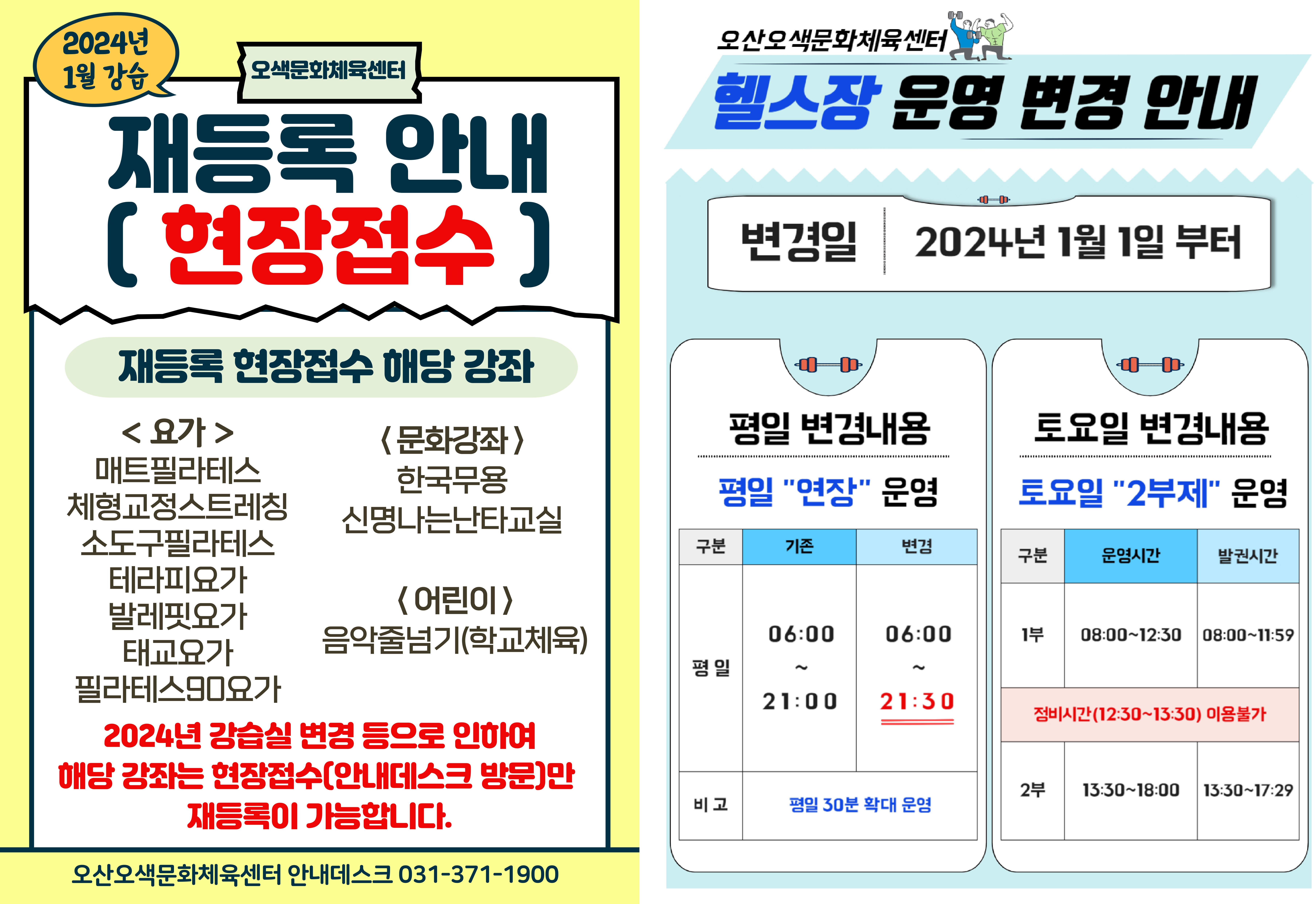 오색문화체육센터 오산오색문화체육센터 12월 접수기간(2024. 1월 강좌) 및 재등록(현장접수) 안내 작성자 osansisul04 등록일자 2023년 12월 18일 9시 52분 26초 조회 1,398 . 2023.12월접수기간(2024.1월 강좌).jpg [ Size : 320.17KB , Down : 2,445 ] 미리보기 다운로드 재등록현장접수,헬스장운영변경.jpg [ Size : 2.75MB , Down : 723 ] 미리보기 다운로드 목록보기
