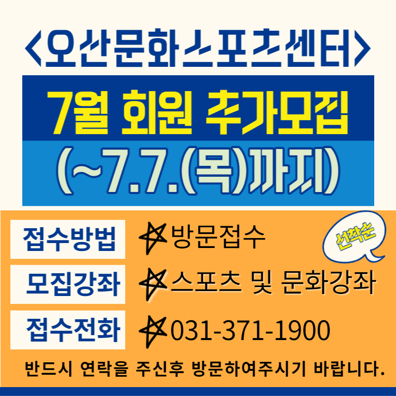 오색문화체육센터 오산문화스포츠센터 7월 회원 추가모집 안내