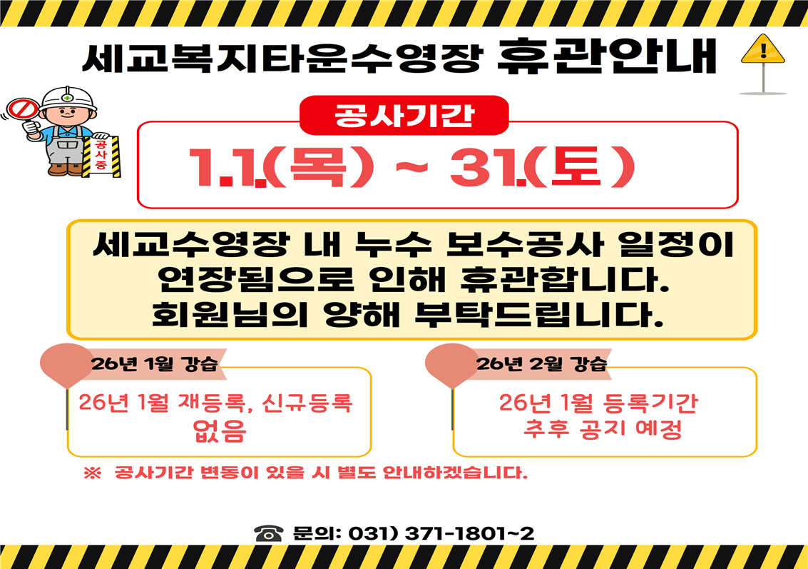 세교복지타운 수영장 [세교] 2026년 1월 누수보수공사 확대로 인한 휴관 연장 안내 작성자 osansisul01 등록일자 2025년 12월 31일 11시 18분 10초 조회 156 내용: 2026년 1월(1일~31일) 누수보수공사 확대로 인한 휴관 연장 - 26년 1월 강습 : 26년 1월 재등록, 신규등록 없음. - 26년 2월 강습 : 26년 1월에 등록기간 추후 공지예정. [세교복지타운 수영장] 2026년 1월 휴관일정.png [ Size : 250.23KB , Down : 10 ] 미리보기 다운로드 목록보기