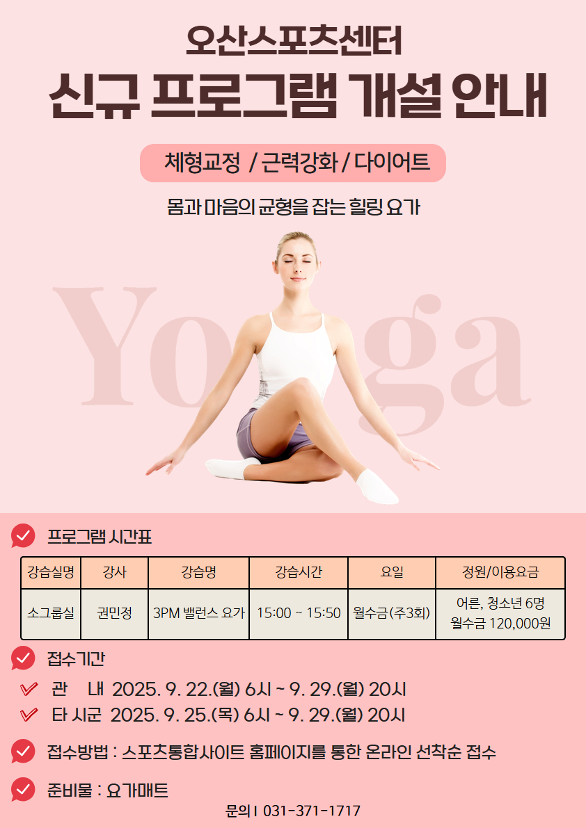 공지 오산스포츠센터 [오산스포츠센터] 요가 "신규" 프로그램 개설안내 작성자 osansisul03 등록일자 2025년 9월 1일 16시 23분 16초 조회 984 요가 신규프로그램 .jpg [ Size : 445.02KB , Down : 1,063 ] 미리보기 다운로드 목록보기