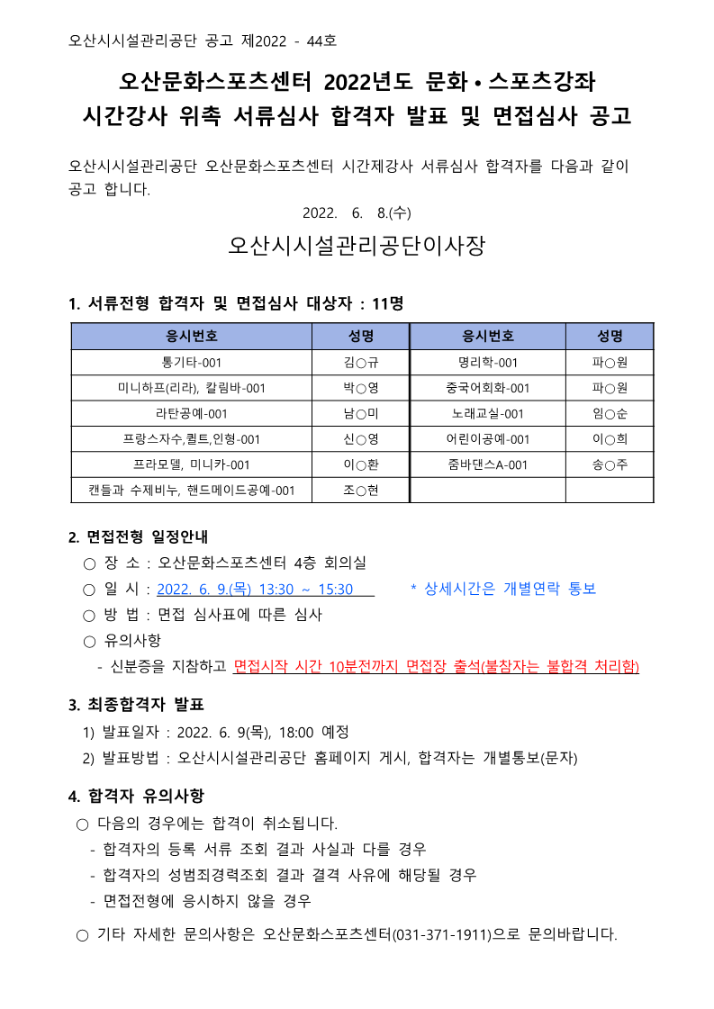 오색문화체육센터 오산문화스포츠센터 2022년도 문화/스포츠강좌 시간강사 위촉 서류심사 합격자 발표 및 면접심사 공고 작성자 허슬기 등록일자 2022년 6월 8일 18시 19분 21초 조회 785 . 10. 오산문화스포츠센터 시간강사위촉 서류심사 합격자 발표 및 면접심사 공고220608_1.png [ Size : 114.09KB , Down : 1,219 ] 미리보기 다운로드 목록보기