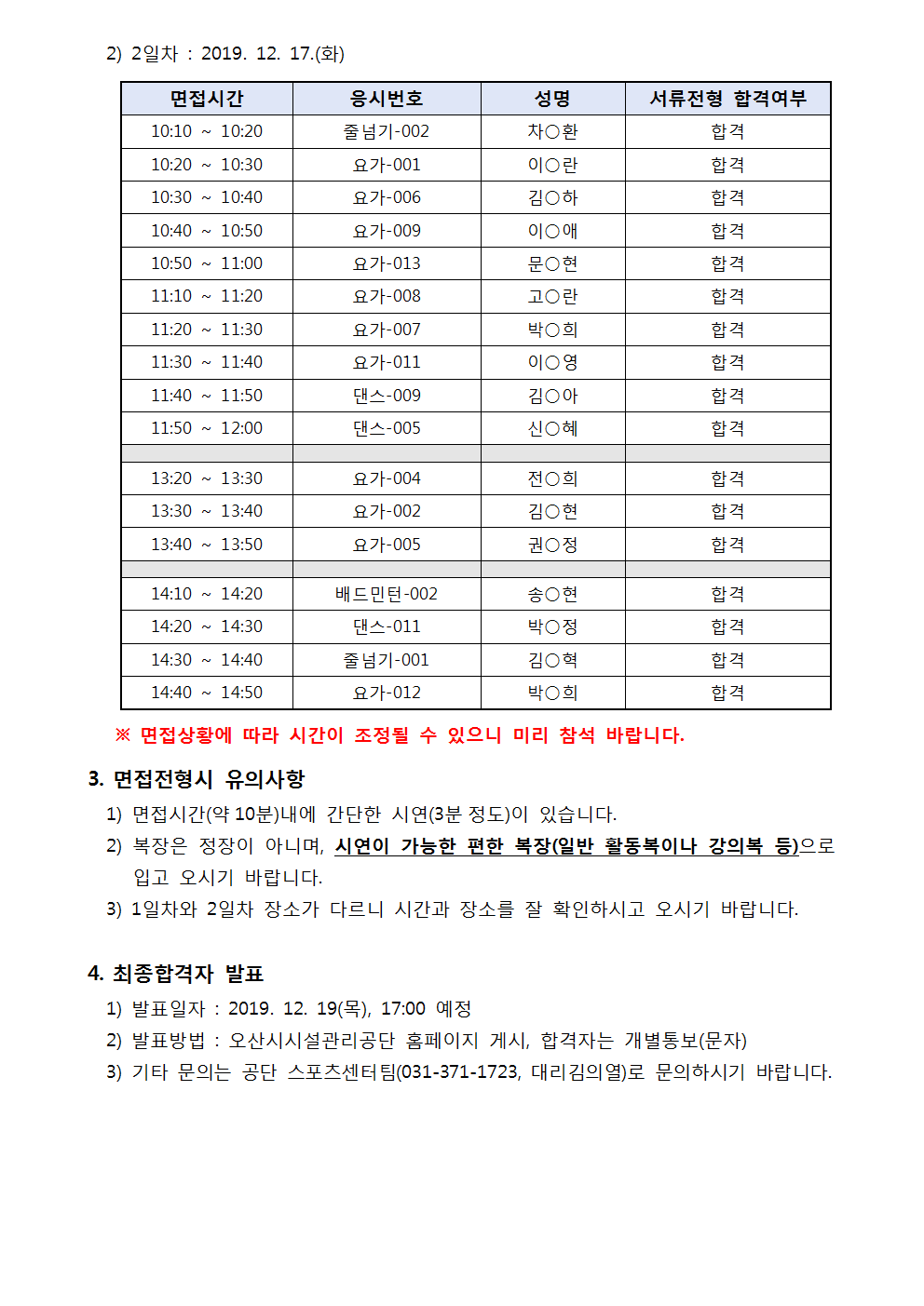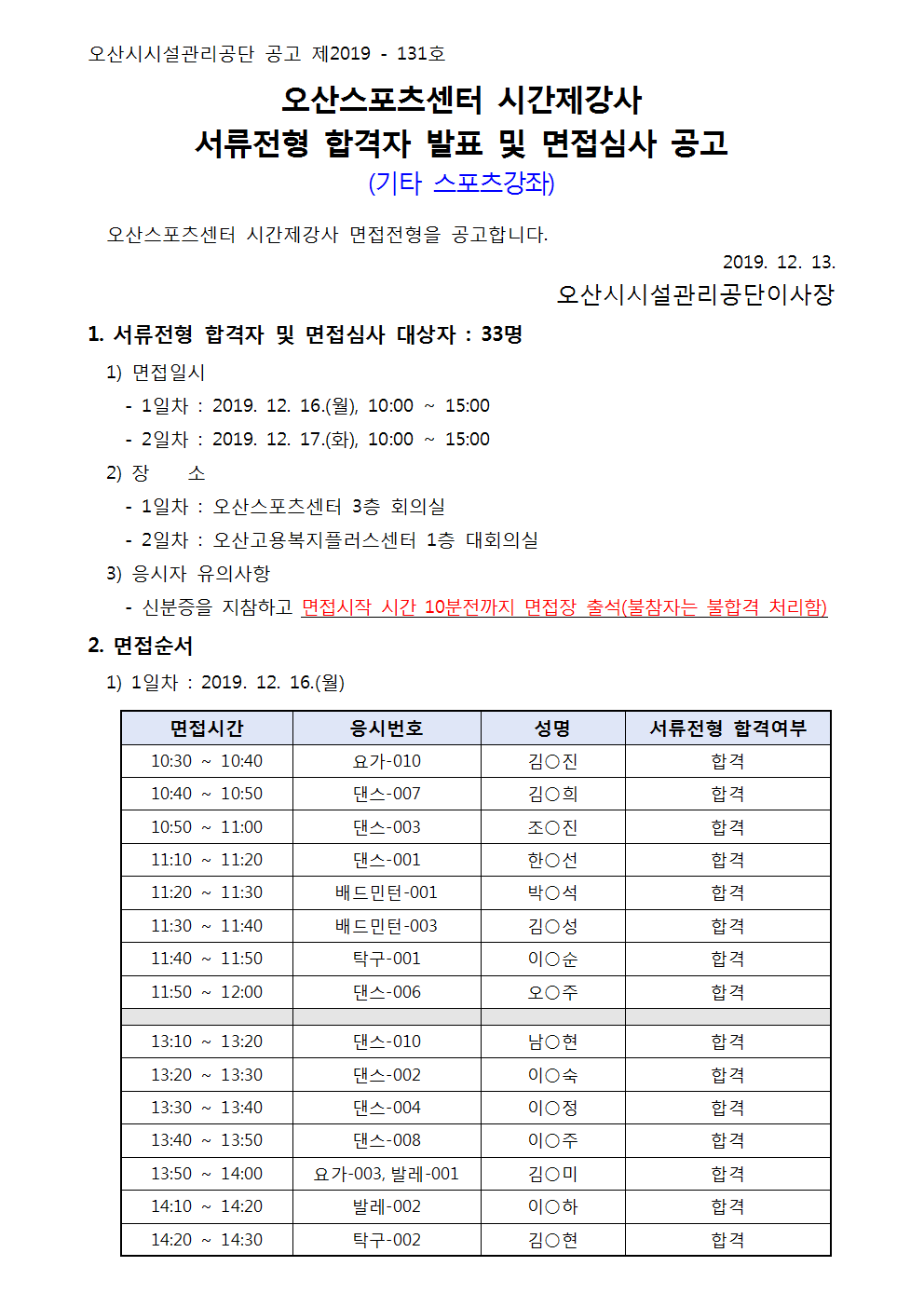 오산스포츠센터 오산스포츠센터 시간제강사 서류전형 합격자 발표 및 면접심사 공고 작성자 최고관리자 등록일자 2019년 12월 13일 13시 52분 23초 조회 1,486 합격자001.bmp [ Size : 3.98MB , Down : 153 ] 미리보기 다운로드 합격자002.bmp [ Size : 3.98MB , Down : 150 ] 미리보기 다운로드 목록보기