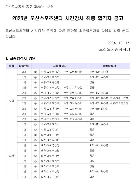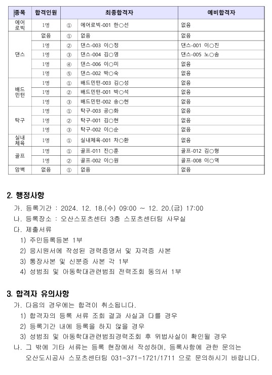 오산스포츠센터 2025년 오산스포츠센터 시간강사 최종합격자 공고 작성자 osansisul03 등록일자 2024년 12월 17일 17시 0분 32초 조회 1,878 스크린샷 2024-12-17 172129.jpg [ Size : 93.77KB , Down : 2,352 ] 미리보기 다운로드 스크린샷 2024-12-17 172148.jpg [ Size : 94.84KB , Down : 2,208 ] 미리보기 다운로드 목록보기