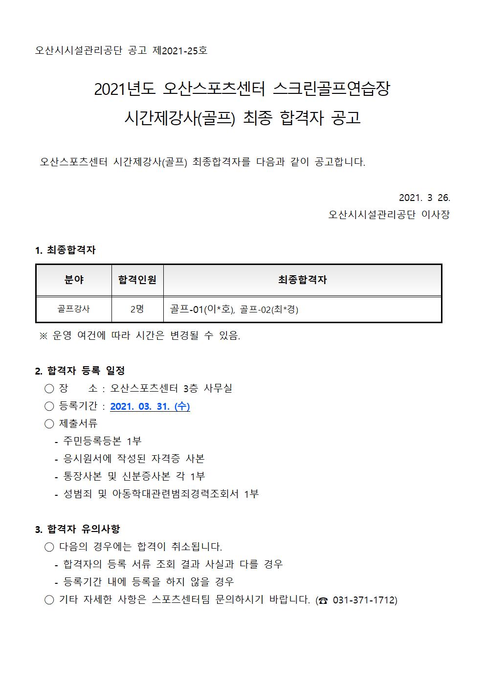 오산스포츠센터 2021년도 오산스포츠센터 스크린골프연습장 시간제강사(골프) 최종 합격자 공고 작성자 최고관리자 등록일자 2021년 3월 26일 16시 40분 8초 조회 1,199 image001.jpg [ Size : 108.41KB , Down : 482 ] 미리보기 다운로드 목록보기